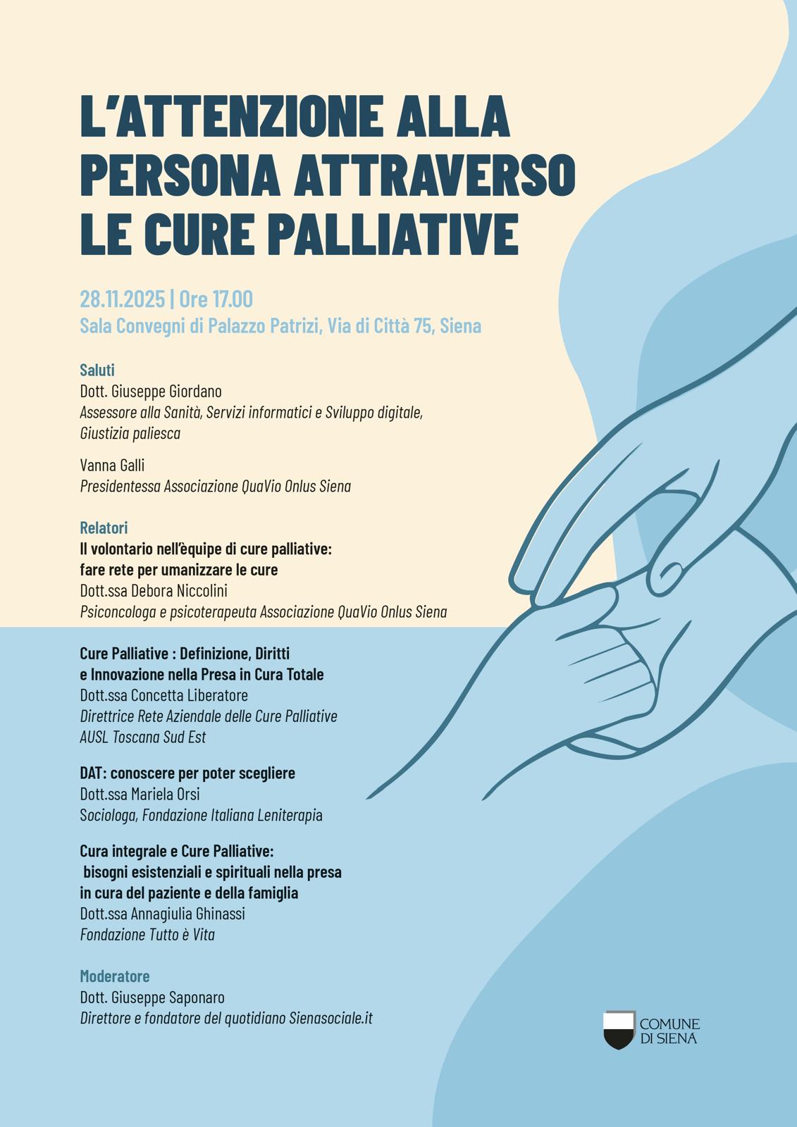 Accompagnare le persone e le loro famiglie nel momento più fragile dell’esistenza è una responsabilità che coinvolge l’intera comunità. Con questo spirito, in occasione della Giornata nazionale delle cure palliative, il Comune di Siena promuove il convegno “L’attenzione alla persona attraverso le cure palliative”, in programma venerdì 28 novembre alle ore 17.30 in Sala Patrizi (via di Città, 75). L’appuntamento nasce dalla sinergia tra amministrazione comunale, terzo settore e professionisti della sanità, e rappresenta un invito a riflettere su un tema che unisce competenza, umanità e diritti.