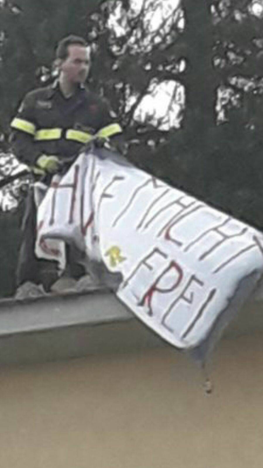 A darne notizia i vigili del fuoco, chiamati dal dirigente scolastico per rimuovere lo striscione, che ha destato scandalo e sorpresa Intervenuta anche la vigilanza V.o.l.p.e. Si cercherà di capire se si è trattato di una infelice “goliardata” di uno studente o un messaggio volutamente lanciato in occasione del giorno della memoria da qualche movimento politico.