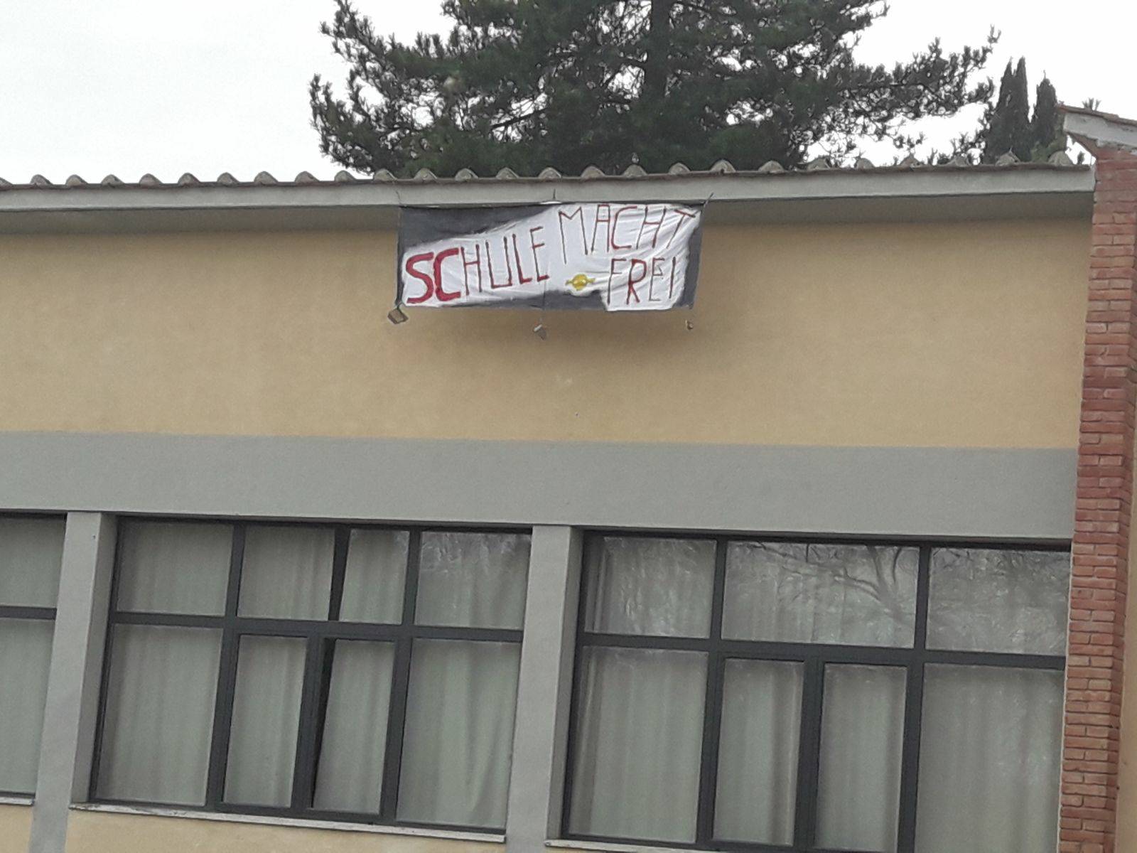 Stamattina, sotto il tetto dell’istituto Agrario di Siena Bettino Ricasoli è spuntato un striscione particolarmente inquietante, che recitava in tedesco”Schule Macht Frei” (la scuola rende liberi), in chiaro riferimento al tristemente noto motto all’ingresso del campo di concentramento di Auschwitz, “arbeit macht frei”.
