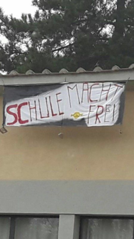 Sotto il tetto della scuola la scritta “Schule Macht Frei”, con chiaro riferimento al motto del cancello di Auschwitz