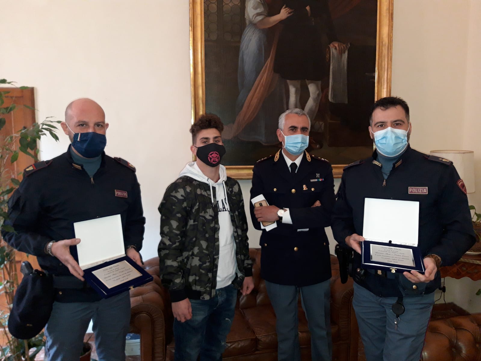 Alla presenza del Questore Costantino Capuano, accompagnati dal dirigente dell’Ufficio Prevenzione Generale e Soccorso Pubblico Fausto Camisa, Luciano e Pietro hanno così potuto ricevere personalmente, durante un breve ma intenso incontro, il grazie da parte del giovane e della sua famiglia. Nell’occasione il ragazzo ha inteso sigillare il nobile gesto anche con la consegna ai due agenti di una targa ricordo.