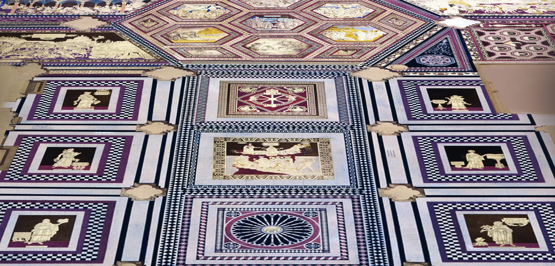 L’itinerario inizia dalla porta d’ingresso, quella di destra rispetto al portale centrale, sul cui architrave si legge un’iscrizione relativa al primo Giubileo dell’era cristiana indetto da papa Bonifacio VIII, il 22 febbraio del 1300: si tratta di alcuni “versi leonini” in lingua latina – dovuti allo scrittore pontificio Silvestro di Adria – che venivano recitati cantilenando dai pellegrini diretti verso Roma. Una volta varcata la soglia, il visitatore potrà ammirare le scene realizzate con la tecnica del commesso marmoreo, l’accostamento di marmi policromi provenienti dal territorio circostante la città, e dello sgraffio, l’incisione dei contorni che seguono il cartone preparatorio disegnato da artisti, quasi tutti “senesi”, fra cui il Sassetta, Domenico di Bartolo, Matteo di Giovanni, Domenico Beccafumi, con l’eccezione del pittore umbro Pinturicchio, autore del celebre riquadro con il Monte della Sapienza-Felicità, raffigurazione della via verso la Virtù come raggiungimento della quiete interiore, attraverso la filosofia e la conoscenza. Come osserva il prof. Giovanni Minnucci, Rettore dell’Opera della Metropolitana di Siena, “la visione complessiva delle cinquantasei tarsie del pavimento può rappresentare un momento di personale e silenziosa riflessione, dimentichi, almeno momentaneamente, delle nostre corse affannose e delle nostre quotidiane preoccupazioni, alla ricerca proficua del senso che ciascuno di noi intende dare alla propria vita. Un senso che, per il fedele, nel Tempio senese dedicato a Maria SS.ma Assunta, non può non sublimarsi nella meditata ricerca di Dio”.