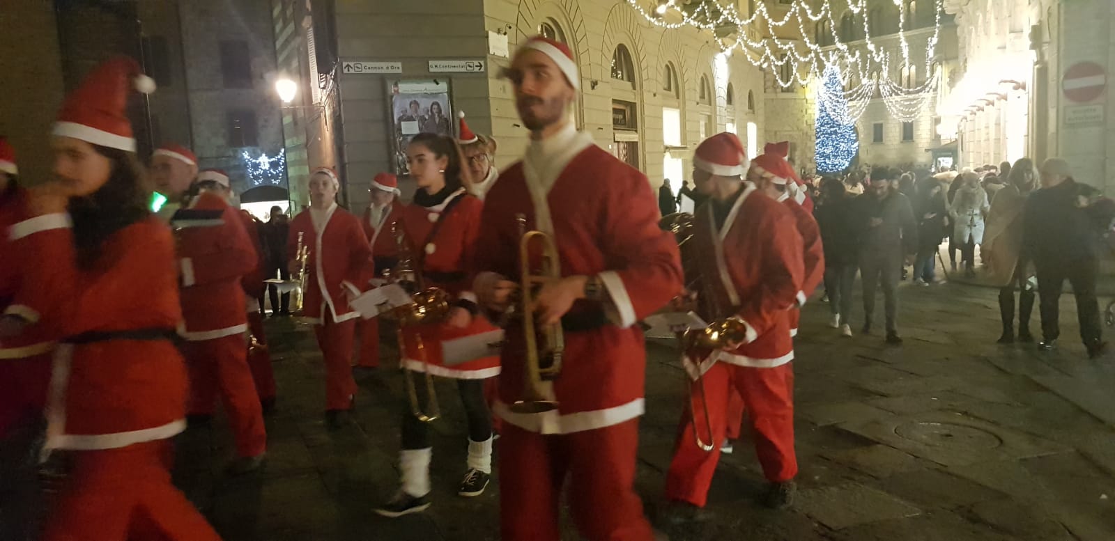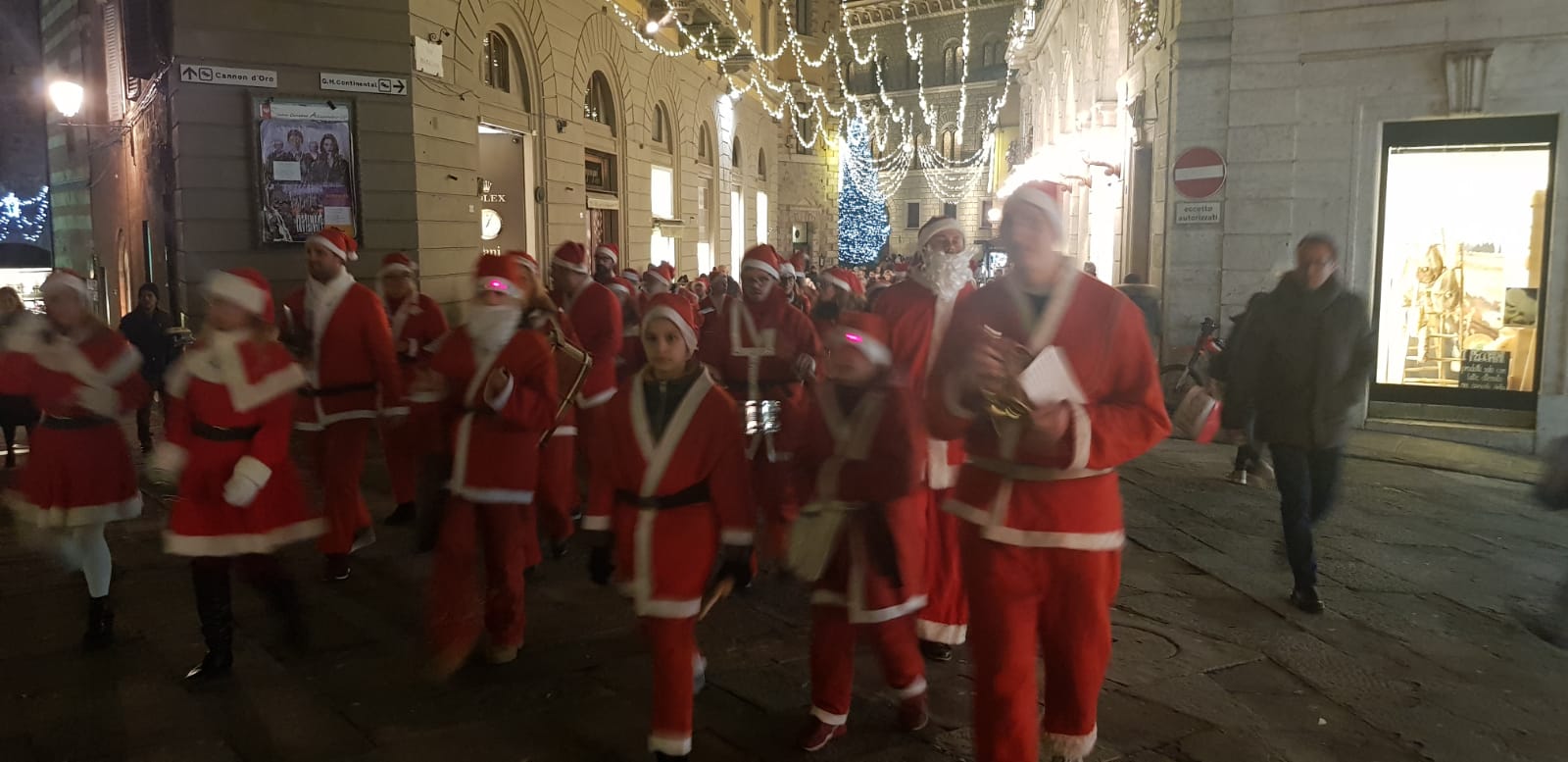 Babbi Natale in musica a Siena. Grazie ai componenti della Banda Città del Palio che ieri pomeriggio, indossando i costumi di Babbo Natale, hanno attraversato le strade del centro suonando e portando colore e allegria. Un’ iniziativa divertente e apprezzata da grandi e piccoli.