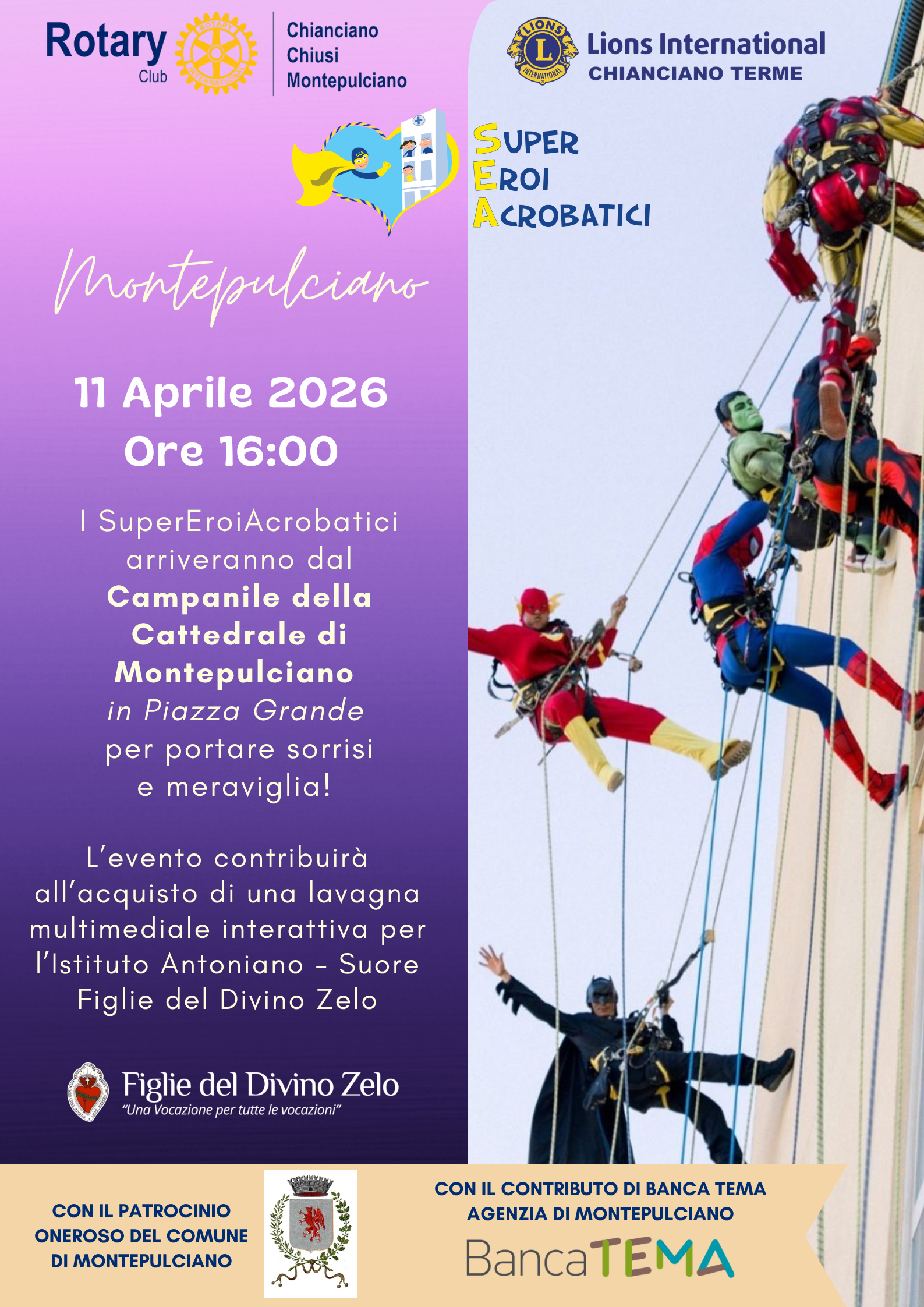 I volontari dell’associazione, vestiti come i più amati supereroi, si caleranno dal campanile della Cattedrale di Montepulciano in Piazza Grande, regalando uno spettacolo unico capace di incantare grandi e piccoli. Un’iniziativa pensata per portare sorrisi, meraviglia e un messaggio concreto di vicinanza, in perfetto stile SuperEroiAcrobatici.