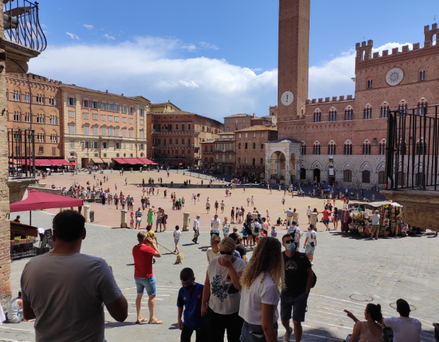 Poteva sembrare una mattinata estiva “quasi” normale quella di oggi nel centro di Siena, dove erano davvero tanti i turisti a passeggio sulle lastre, sia italiani che stranieri. Corpose file davanti al Santa Maria della Scala e Duomo, tanti gruppetti in Piazza del Campo e, tradizionalmente a fare le foto alla Costarella, intenso andirivieni in Via di Città come ai vecchi tempi – tanto che il passo spesso si blocca – tavolini dei bar e ristoranti pieni di gente a fare colazione o pranzo.