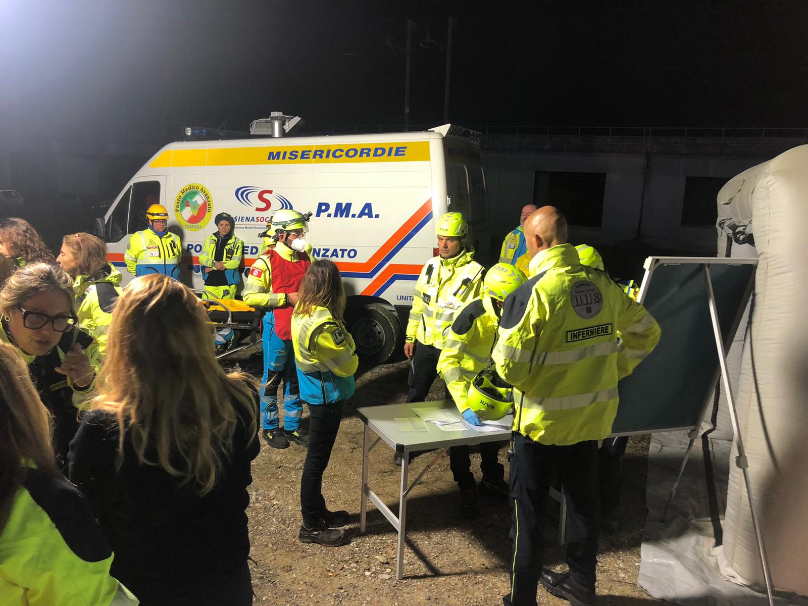 La centrale dell’emergenza sanitaria di Siena e Grosseto, ricevuta la chiamata dalla centrale regionale 112, ha messo in moto immediatamente il protocollo operativo maxiemergenza attivando i Vigili del fuoco e inviando sul posto due automediche, due ambulanze e diverse ambulanze blsd con soccorritori anche volontari formati alle emergenze oltre al furgone logistico delle maxiemergenze. Ha attivato poi il Posto medico avanzato (Pma) con i soccorritori volontari del Siena soccorso.