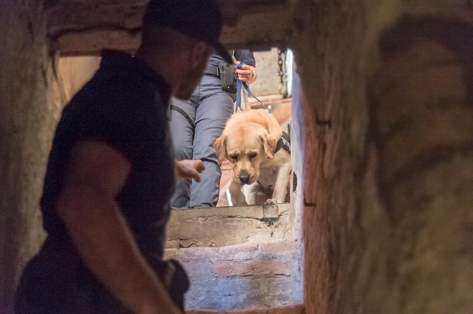 Fester, il cane poliziotto, insieme a Francesca il suo conduttore, è stato al lavoro insieme agli artificieri per la bonifica sotto i palchi e nei bottini per la prova mattutina del Palio.