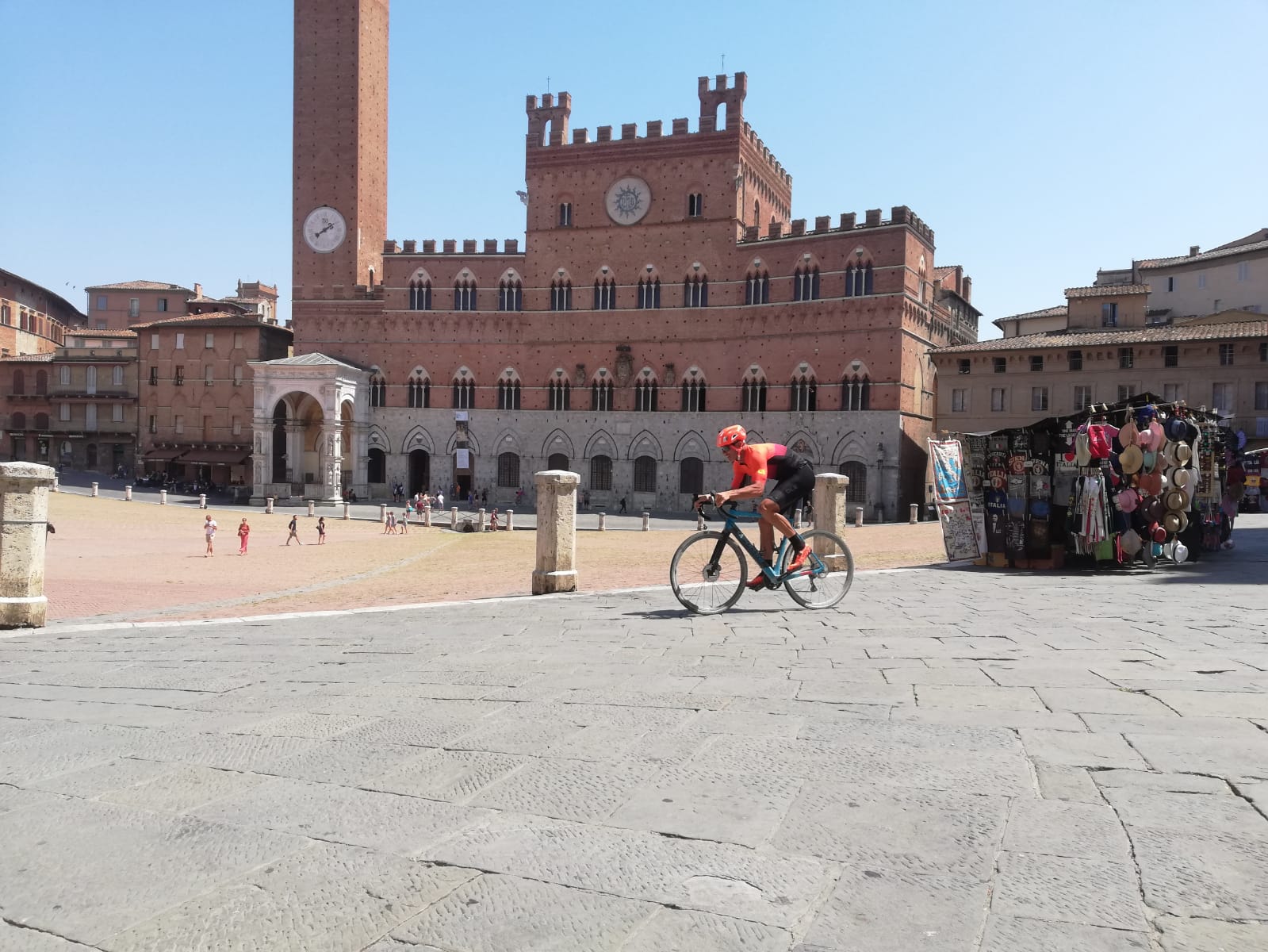 Sotto lo sguardo incuriosito di turisti e passanti, Cipollini, seguito da telecamere e un drone, si è esibito in alcune discese dalla Costarella e tre giri di Piazza, come ad omaggiare la Festa della quali i senesi sono stati quest’anno privati. Più complicati invece i giri all’interno della conchiglia: la conformazione a lisca di pesce non è il massimo per il grip, e se n’è accorto anche l’esperto ciclista, protagonista anche di una caduta di fronte a Fonte Gaia, dalla quale si è però per fortuna rialzato con il sorriso, senza neanche un graffio.