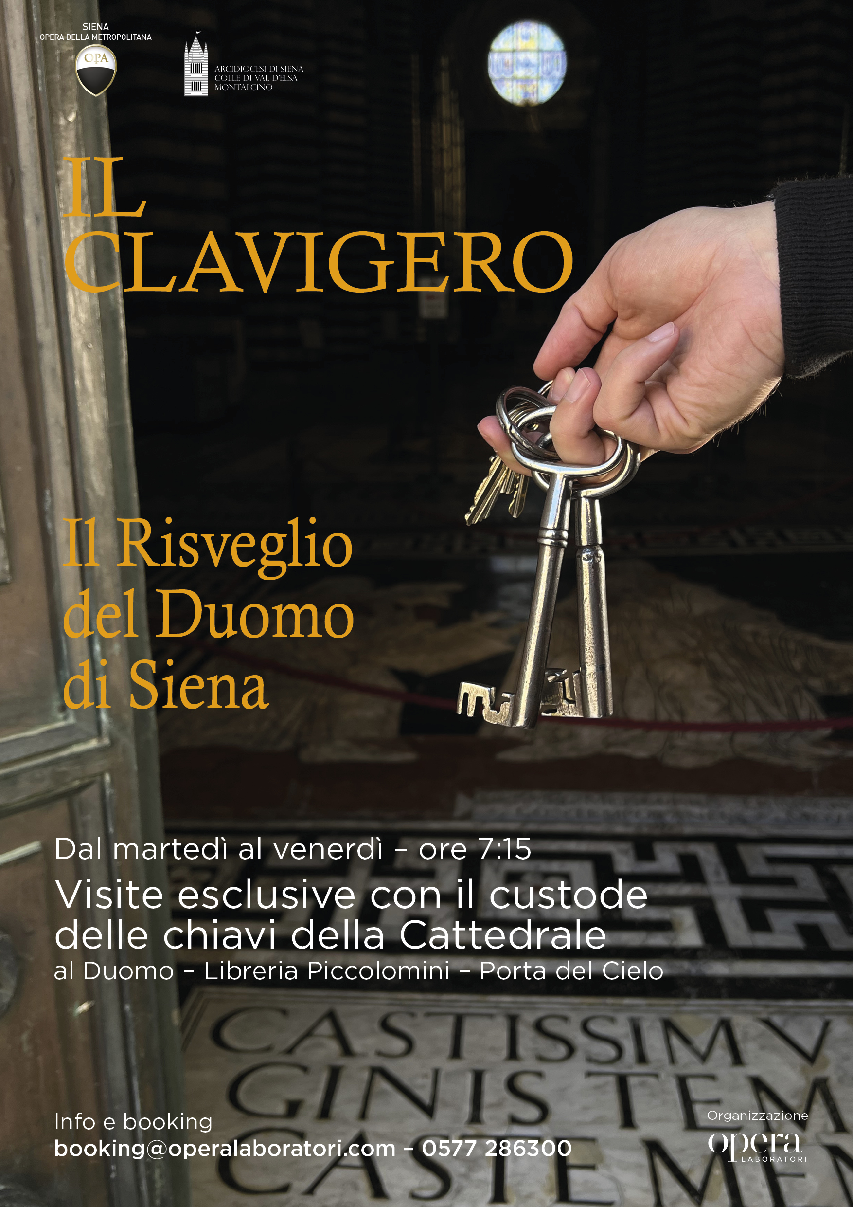 Il clavigero: il risveglio del Duomo di Siena è, infatti, una delle esperienze culturali speciali promosse dall’Opera della Metropolitana e organizzate da Opera Laboratori che condurranno i visitatori, per un massimo di 18 persone, alla scoperta di questo capolavoro. Dal martedì al venerdì per venti giorni sarà possibile prendere parte ad un tour esclusivo, con inizio alle ore 7,15 fino alle ore 8,45, seguendo l’apertura, l’accensione delle luci, l’organizzazione e la preparazione all’accoglienza insieme a coloro che quotidianamente si adoperano al “risveglio” della Cattedrale. Quando le prime luci del giorno si stagliano all’orizzonte, il maestoso complesso monumentale del Duomo di Siena accoglierà i visitatori incantati dalla facciata in marmi policromi che si ‘tingono’ con l’arrivo dei raggi solari: l’inizio sereno di una giornata unica.
