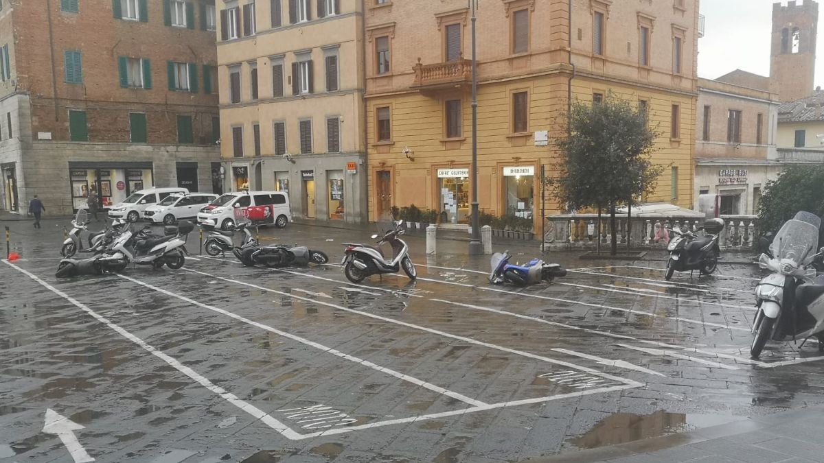 Il forte vento scaraventa a terra i motorini parcheggiati in Piazza della Posta