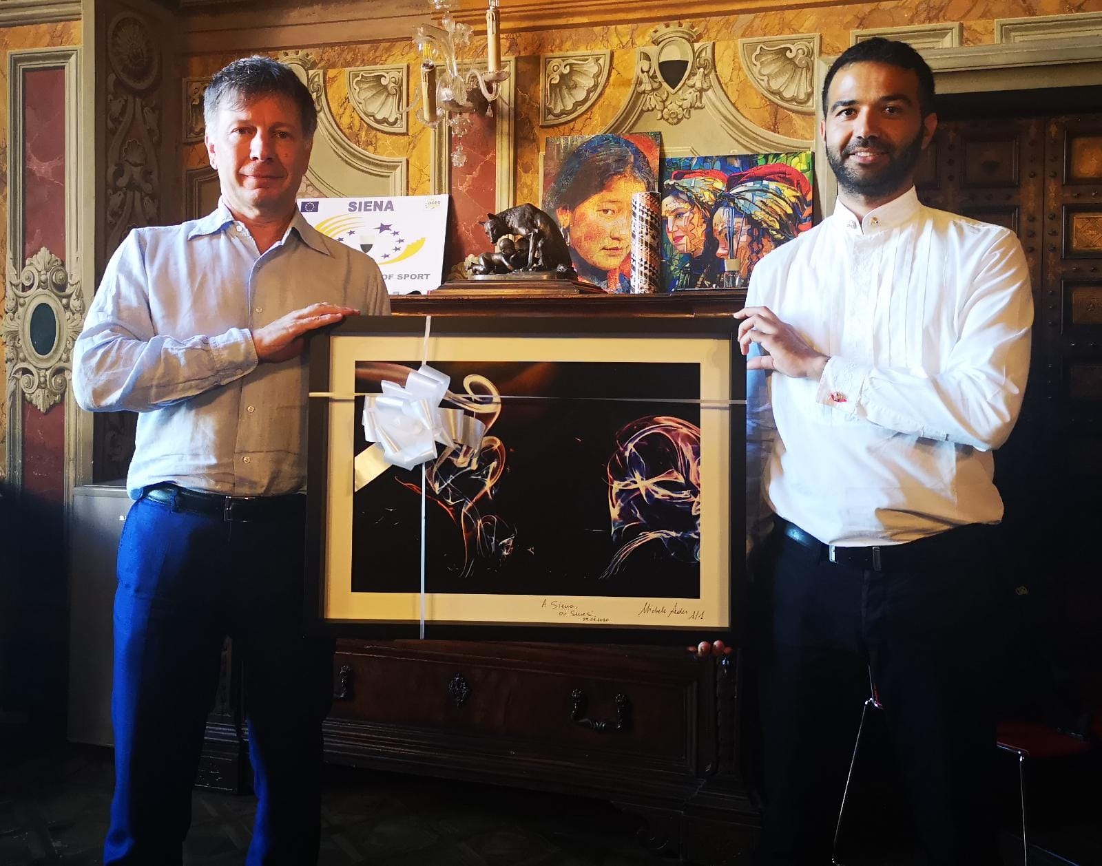 Un regalo a Siena ed ai senesi nei giorni in cui la città avrebbe dovuto vivere la sua Festa. A consegnarlo al sindaco Michele Ardu, fotografo che per il National Geographic ha seguito il Palio di Siena e ne è rimasto affascinato. Non solo della Carriera ma della città e dei suoi abitanti e della magia che trasmettono.