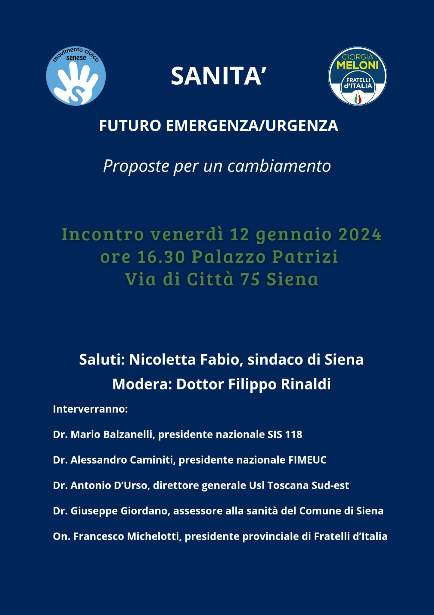 Il Movimento Civico Senese e Fratelli d’Italia organizzano un incontro sul futuro della sanità dal titolo “Futuro Emergenza-Urgenza, proposte di un cambiamento”. Al centro del convegno, che avrà luogo domani, venerdì 12 gennaio alle 16.30 a Palazzo Patrizi, ci sarà quindi un tema è di stretta attualità, al punto che basta aprire gli organi di informazione per comprendere le difficoltà in cui si trovano ad operare nei pronto soccorsi italiani.