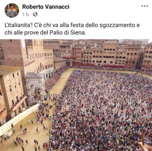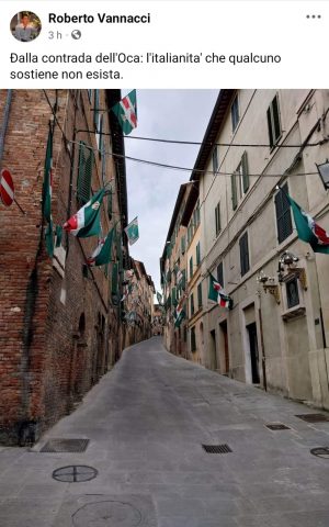 In una, con una visione aerea della Piazza del Campo, ha commentato “L’italianita’! C’è chi va alla festa dello sgozzamento e chi alle prove del Palio di Siena”, in un’altra immagine invece delle bandiere ocaiole, a corredo ha scritto: “dalla contrada dell’Oca: l’italianita’ che qualcuno sostiene non esista”. Infine una foto di gruppo con dei giovani contradaioli, condita della didascalia “la meglio gioventù”.