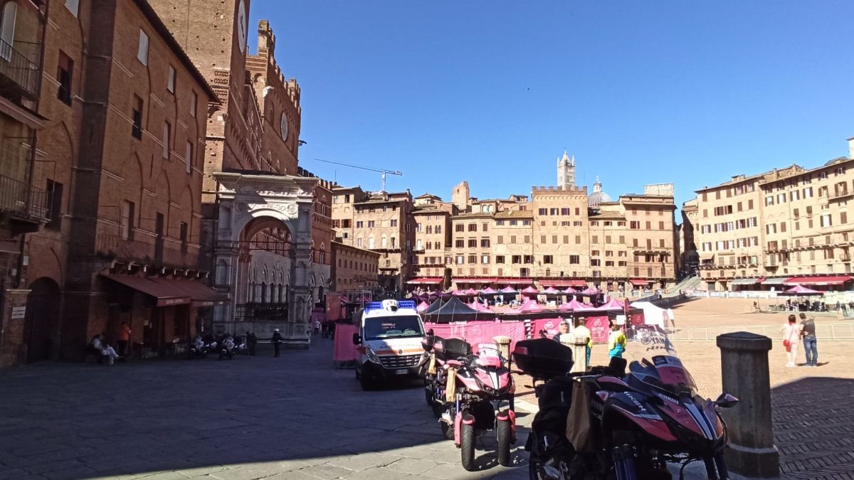 Tutto pronto per la partenza della 12esima tappa del giro d’Italia che partirà da piazza del campo alle 11.20 direzione Bagno di Romagna lungo oltre 200chilometri. La piazza è ovviamente off limits a macchine e pedoni fata eccezione per gli addetti ai lavori. C’è gran fermento ed entusiasmo nonostante sia un giro d’Italia diverso da solito e condizionato dalla situazione pandemica.