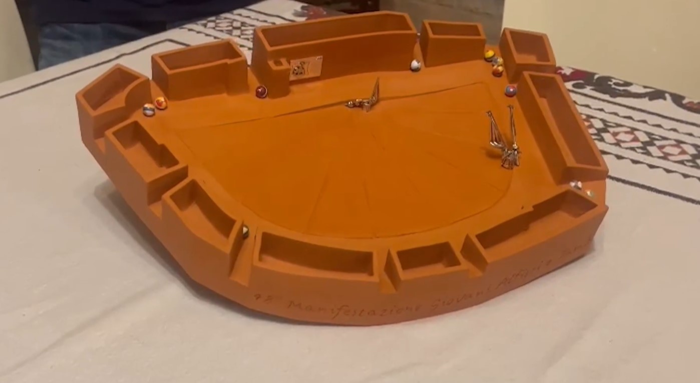 Il premio è una riproduzione di Piazza del Campo in terracotta, “il colore che più si avvicina alla Piazza quando è vestita a festa – spiega il realizzatore Vittorio Bocci -, ci sono due piccoli alfieri e un tamburino al Gavinone per simboleggiare i giovani partecipanti, due bandiere grandi e un tamburo imperiale alla mossa per dare loro l’obiettivo di come diventare”.