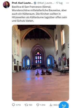 Tra le tappe di Karl Lauterbach anche la città di Siena alla quale ha dedicato un post con la foto della basilica di San Domenico, erroneamente definita basilica di San Francesco, e corredata dalle parole: “Bella costruzione medievale, ma anche cella frigorifera. Le chiese dovrebbero essere aperte durante le ondate di caldo come stanze fredde durante il giorno e offrire protezione”.