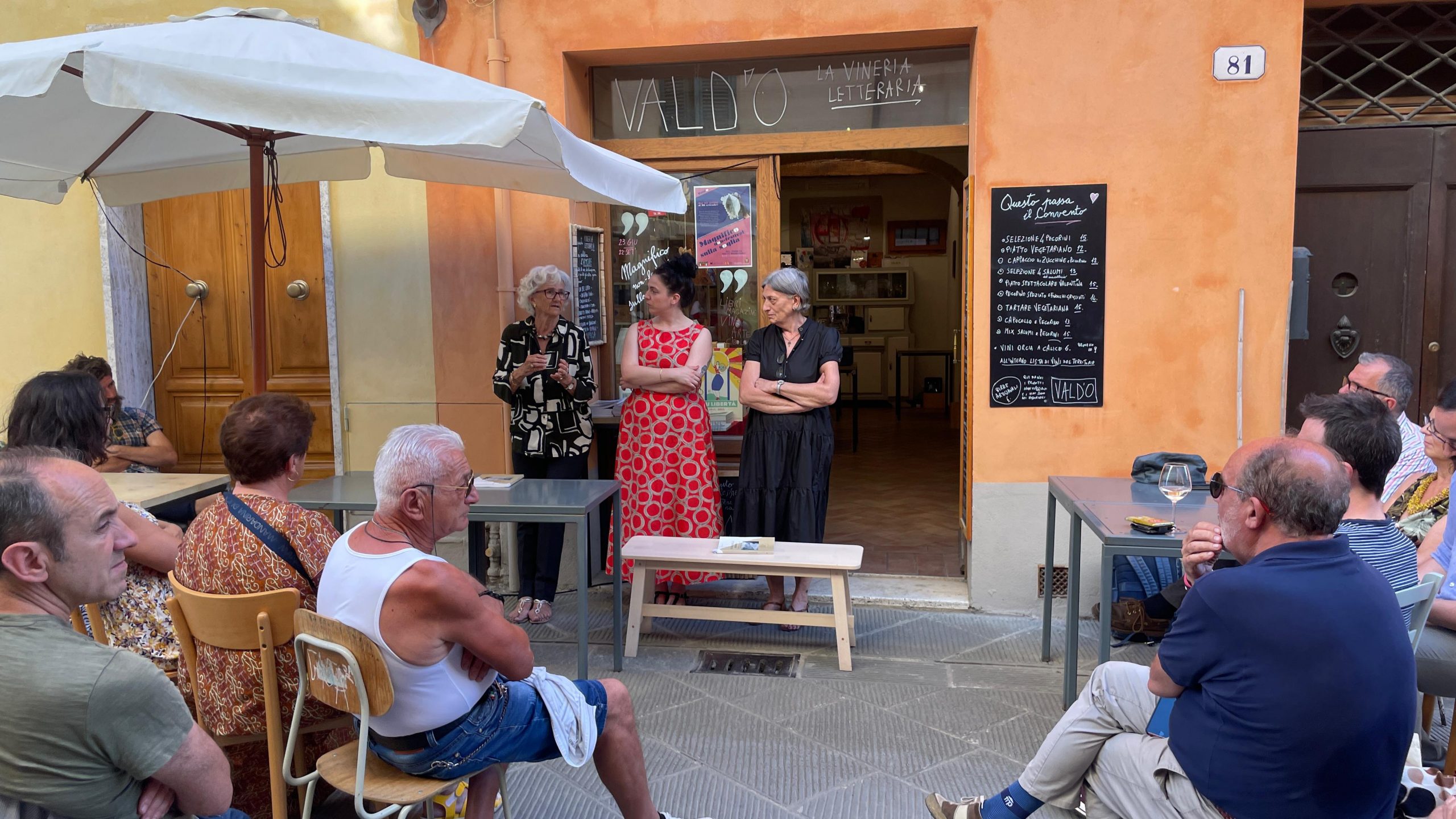 “Ci piaceva stare su questa soglia simbolica – spiega Antonio Cipirani, giornalista e proprietario di Vald’O -, tra una libreria-vineria e una strada, che è la Francigena, perciò luogo di scambio per antonomasia. La nostra è una libreria che dialoga con chi passa. E quindi abbiamo deciso di tirar fuori tavoli e sedie, e di fare tutte le nostre iniziative culturali qui, su questa soglia”.