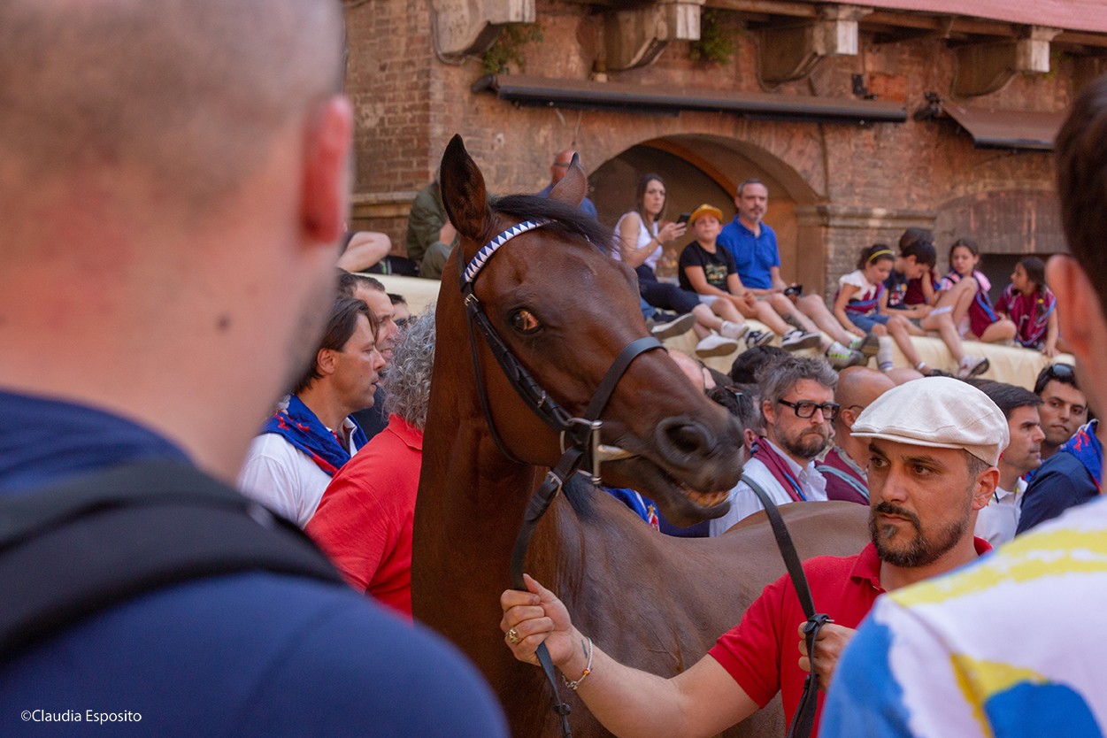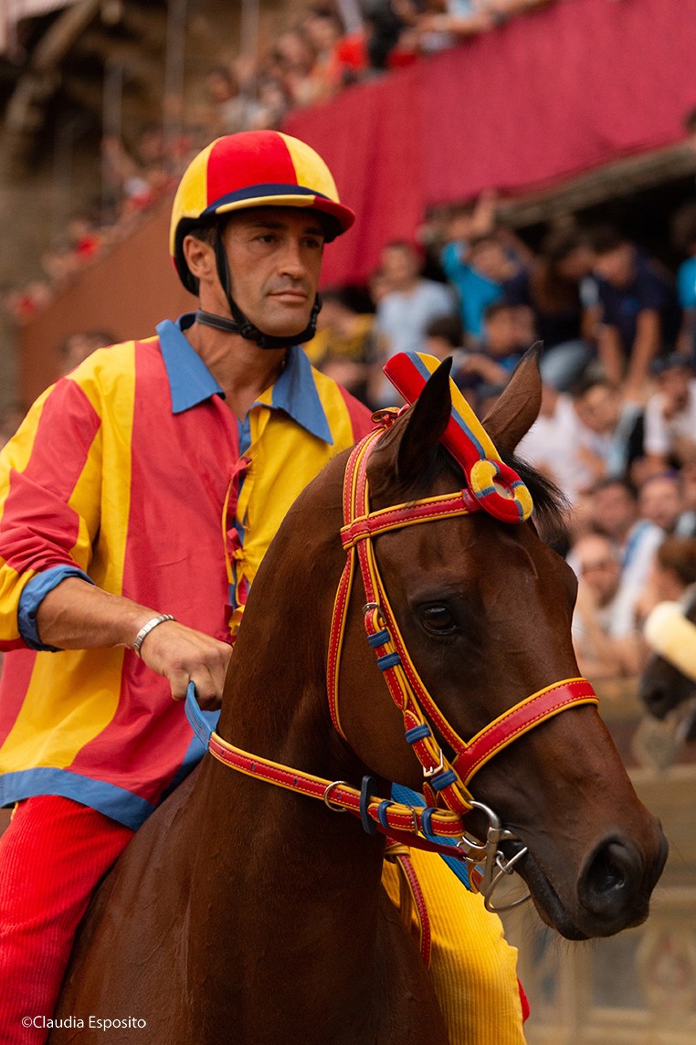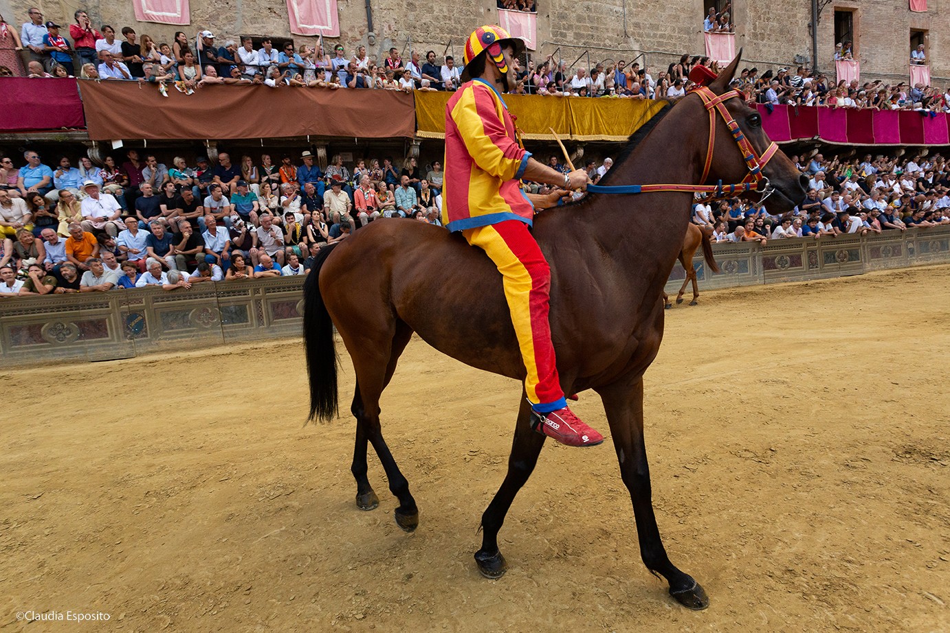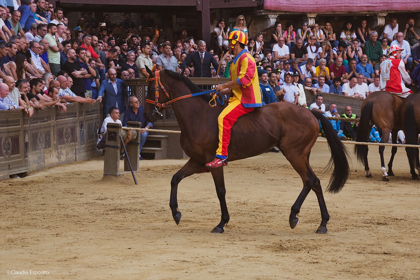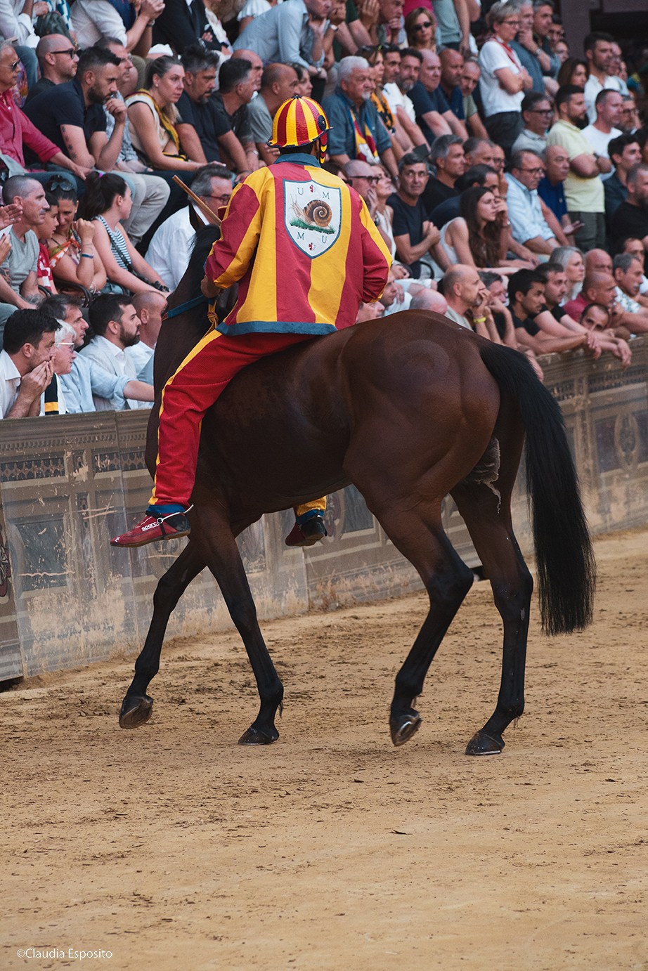 Continuiamo il nostro giro virtuale nelle contrade che hanno partecipato alla carriera di Provenzano per rivivere le emozioni dei giorni del Palio di luglio che si è appena concluso con le immagini “rubate” da Claudia Esposito per Radio Siena Tv. Oggi è la volta della Contrada della Chiocciola,  che ha affidato l’esordiente Anda e Bola a Jonatan Bartoletti detto Scompiglio.
