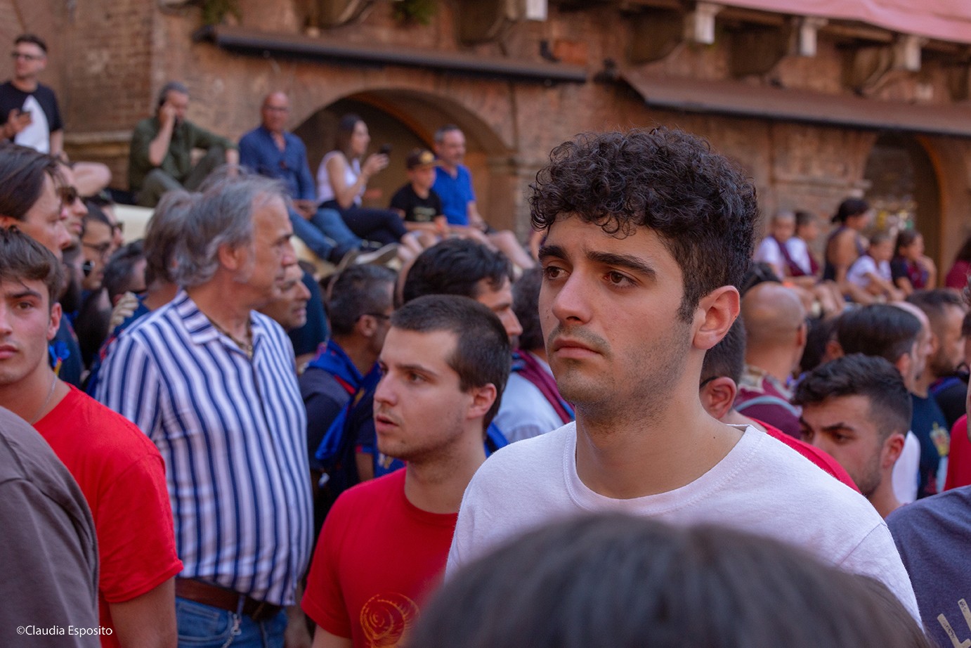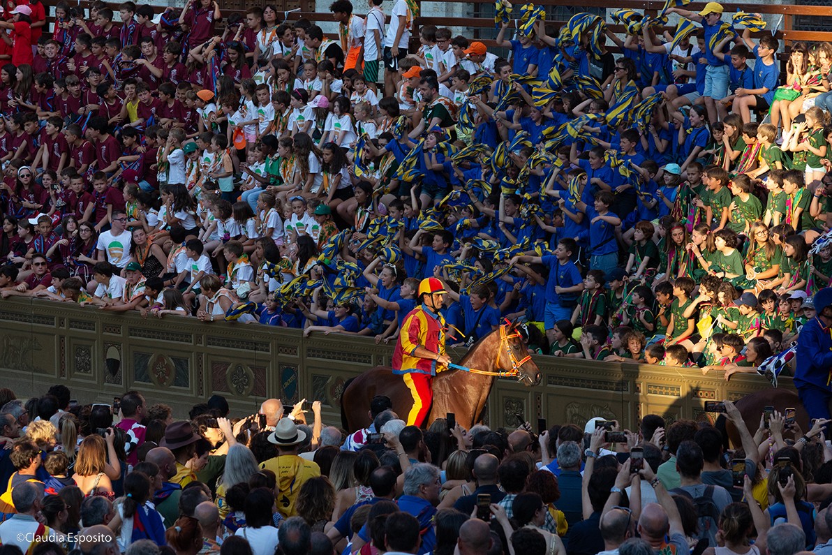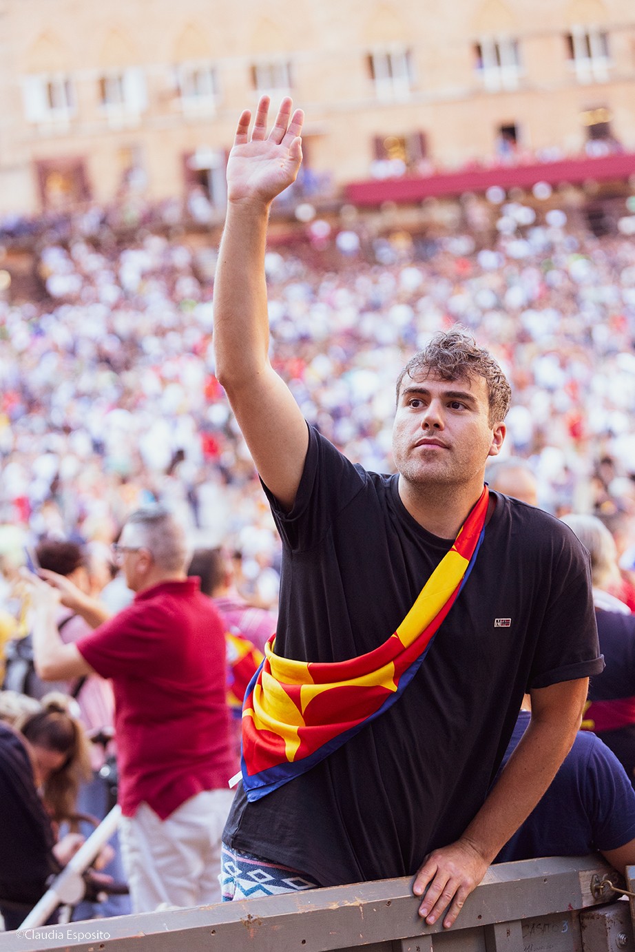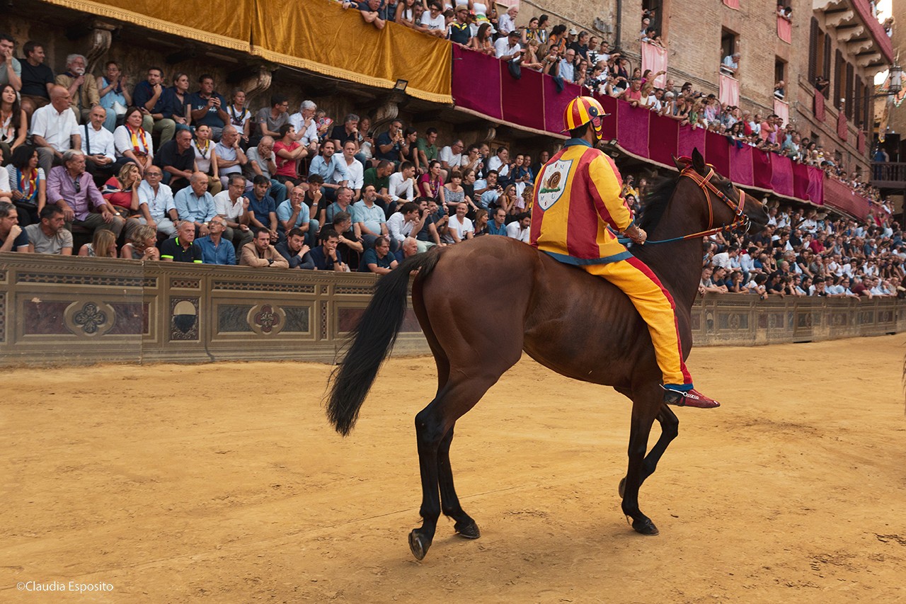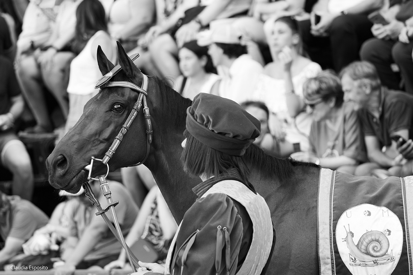 Continuiamo il nostro giro virtuale nelle contrade che hanno partecipato alla carriera di Provenzano per rivivere le emozioni dei giorni del Palio di luglio che si è appena concluso con le immagini “rubate” da Claudia Esposito per Radio Siena Tv. Oggi è la volta della Contrada della Chiocciola,  che ha affidato l’esordiente Anda e Bola a Jonatan Bartoletti detto Scompiglio.