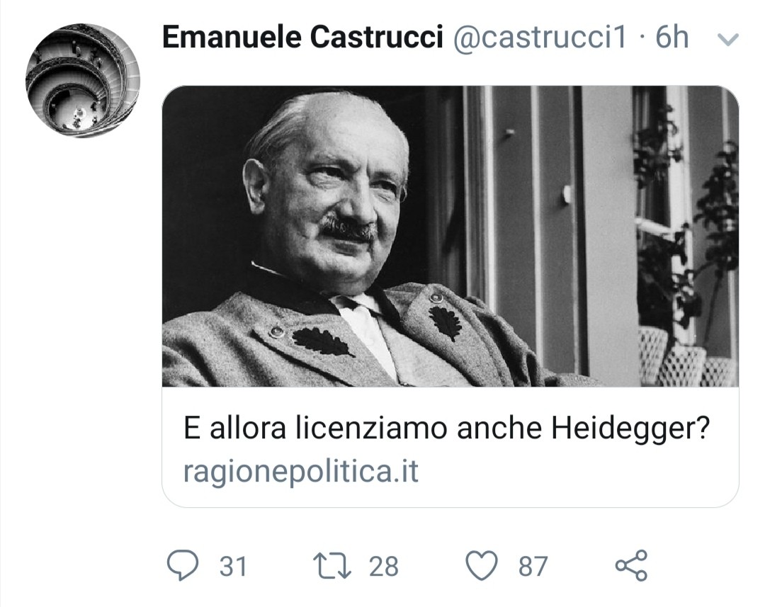 E’ tornato a twittare il prof. Emanuele Castrucci, dopo la bufera che l’ha travolto per le esternazioni social pro nazismo e antisemitismo. Con lo stesso mezzo social attraverso il quale ha espresso posizioni e concetti che hanno indignato e scandalizzato l’intero paese, Castrucci ha commentato la proposta di licenziamento avanzata dall’Università di Siena, postando un articolo di un sito online che lo riguarda, dal titolo “E allora licenziamo anche Heidegger?”. Nuove polemiche si stagliano all’orizzonte.