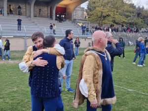 I festeggiamenti del quartiere vincitore sono esplosi con gioia già sul campo di gara, per poi proseguire per le vie del borgo, tra emozioni, abbracci e lacrime di felicità. Le vie di Montalcino si sono così riempite del calore e dell’orgoglio dei quartieranti giallo/blu, sigillando un’altra pagina indimenticabile della Sagra del Tordo.