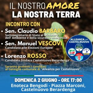 Barbaro, insieme a Manuel Vescovi, candidato al Parlamento Europeo parteciperà ad un incontro dal titolo “il nostro Amore, la nostra Terra” organizzato dalla lista “Alleanza per Castelnuovo” formata da Fratelli d’Italia, Forza Italia, Lega ed Udc ed a cui parteciperanno tutti i candidati della lista che corre per conquistare il popoloso comune chiantigiano.
