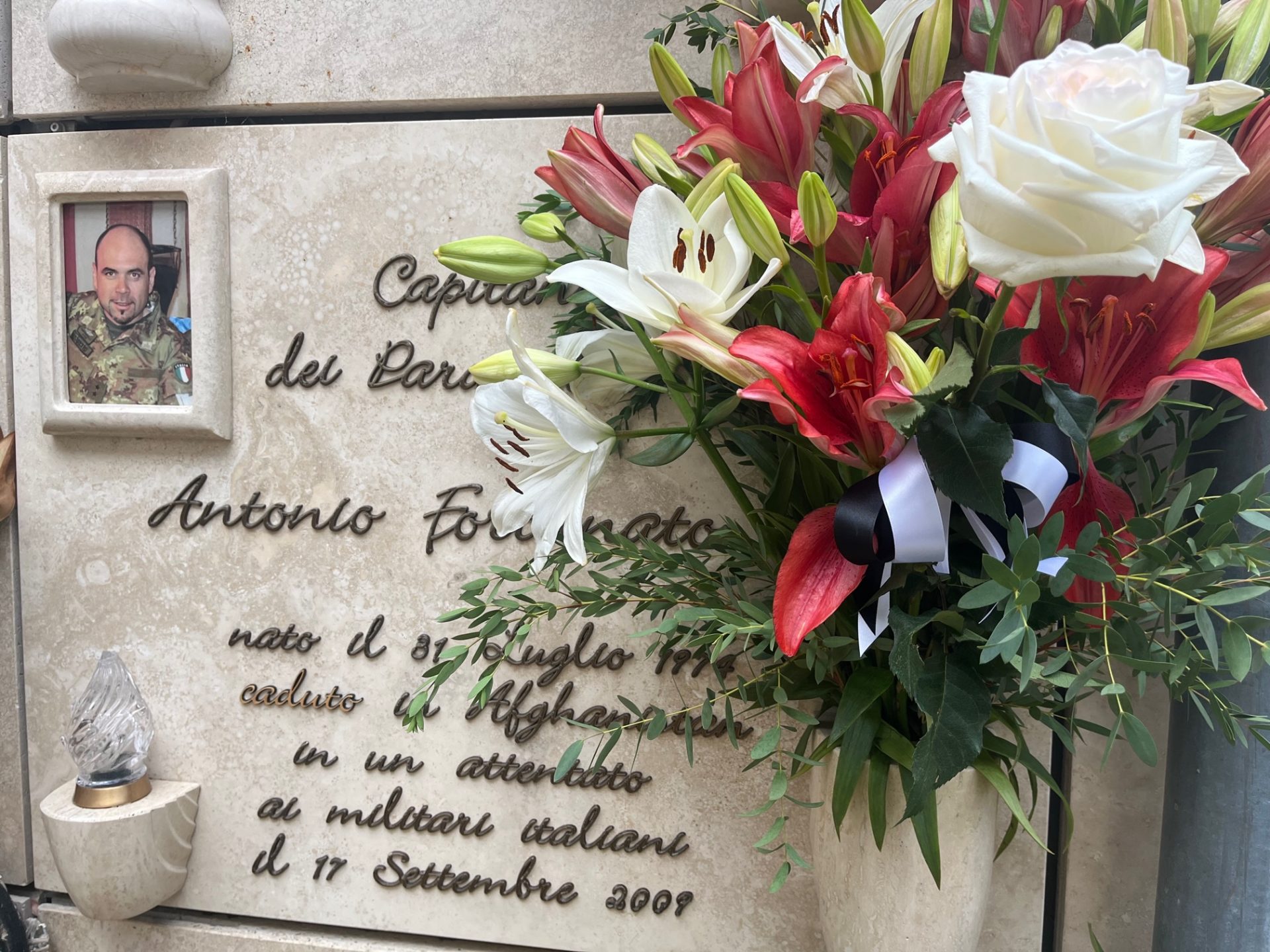 Questa mattina, sabato 17 settembre, in ricordo del sacrificio dei sei giovani militari caduti a Kabul nel 2009, di cui quattro di stanza alla Caserma di Siena, una delegazione della Società bianconera ha deposto un omaggio floreale nella tomba del Capitano paracadutista Antonio Fortunato, nel cimitero di Uopini, alle porte della città. Un gesto a perenne memoria di chi ha offerto la propria vita lavorando per la pace. Kabul.