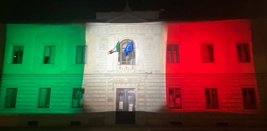 La bandiera italiana è stata proiettata in segno di orgoglio e rispetto verso coloro che indossano la divisa e che in questi giorni di emergenza legata al coronavirus sono in prima linea per il bene della comunità.
