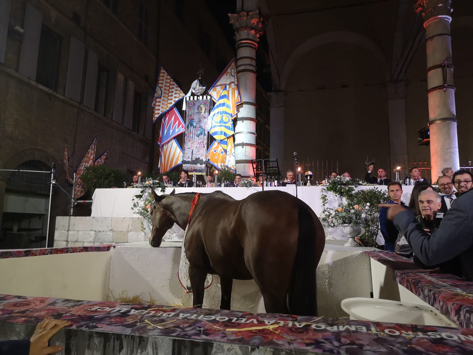 Apparecchiatura e scenografia elegante alle Logge del Papa per i 1300 a cena, con le emozioni che si susseguono, quelle del popolo di Pantaneto che è tornato a riassaporare il gusto della vittoria che mancava da 15 anni.