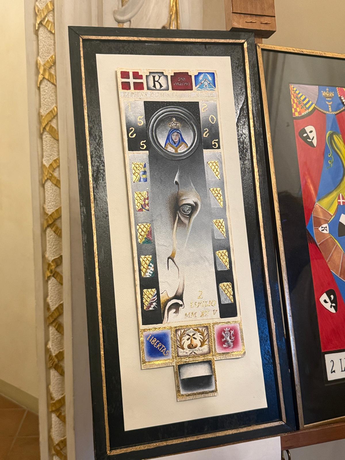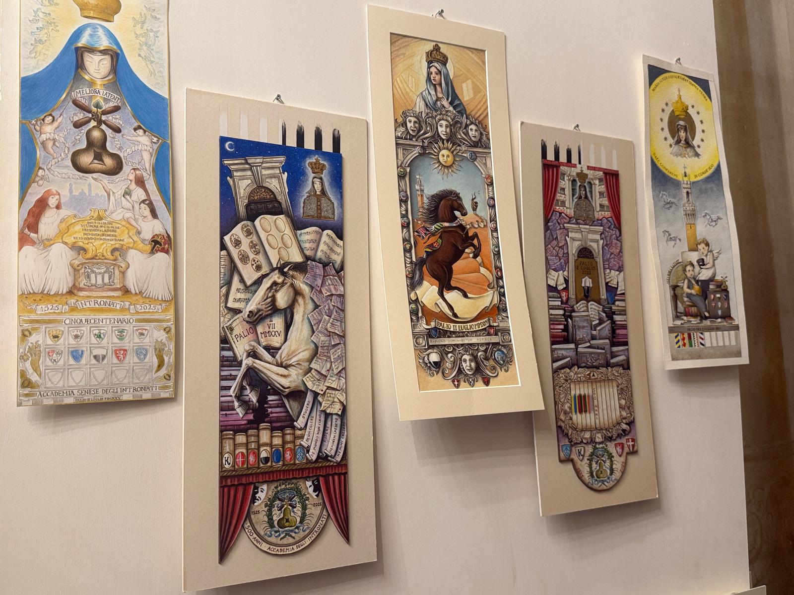 La mostra, aperta al pubblico dal 21 ottobre al 20 novembre, dal lunedì al venerdì negli orari 10.30-13 e 16-19, e il sabato dalle 16 alle 19, sarà l’occasione per scoprire il processo creativo che ha preceduto la realizzazione del Drappellone e per ammirare le diverse visioni artistiche dedicate alla città e alla sua Festa. All’inizio del Novecento, la pittura del Palio era infatti affidata tramite concorso agli studenti e diplomati dell’Istituto di Belle Arti di Siena. Dopo interruzioni e fasi di affidamento diretto, dagli anni ’60 la commissione veniva assegnata a vincitori di concorsi locali o ad artisti senesi di rilievo. Negli anni Novanta l’amministrazione comunale assegnava la pittura del Drappellone in via diretta, mentre a partire dal Duemila, in alcune occasioni, la committenza è stata affidata tramite concorso agli artisti locali. Per il 2025, tra i numerosi bozzetti pervenuti al Comune, è stata selezionata l’opera di Riccardo Manganelli, protagonista dello scorso Palio di luglio. Il concorso ha dedicato la parte allegorica del Drappellone al quinto centenario dell’Accademia degli Intronati di Siena, celebrando la sua attività letteraria e teatrale che, sin dal Cinquecento, ha contribuito a plasmare la vita culturale della città.