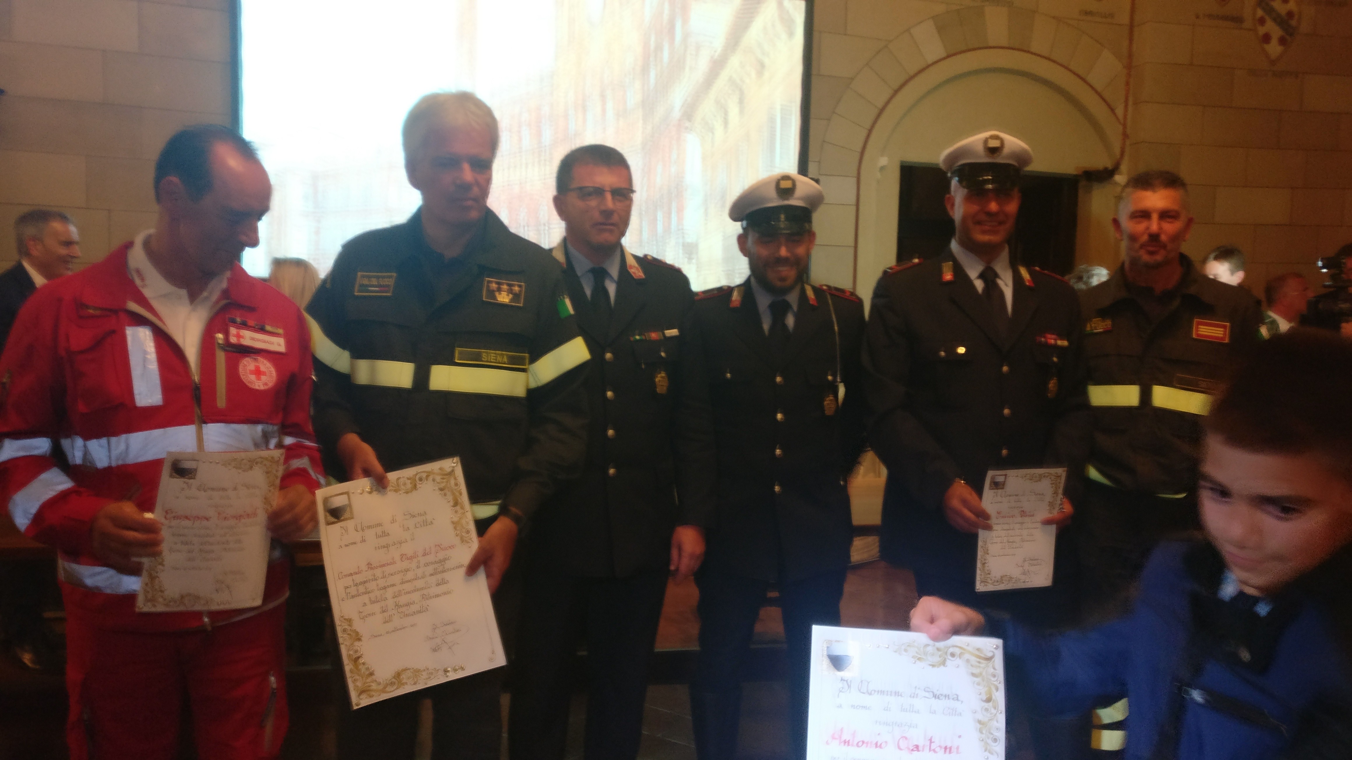 A Enrico Petrini, Antonio Cartoni e Giuseppe Giorgiardi sono andati Sanesi d’Argento e Pergamene, così come al comando dei vigili del fuoco, per il quale sono stati ricordati coloro che sono intervenuti la sera dell’incendio: Antonio Benocci, Antonio Bartolomei, Riccardo Butini, Leonardo Fortezza, Emanuele Serafini, Luca Barbarossa, Marco Sammarchi, Marco Mariani, Riccardo Martignoni, Andrea D’Ortenzio, Marco Montagnani, Maurizio Livi, Massimo Rinaldi, Guido Cucini, Giacomo Petreni, il vice comandante Domenico Carriero e il comandante Luca Nassi.