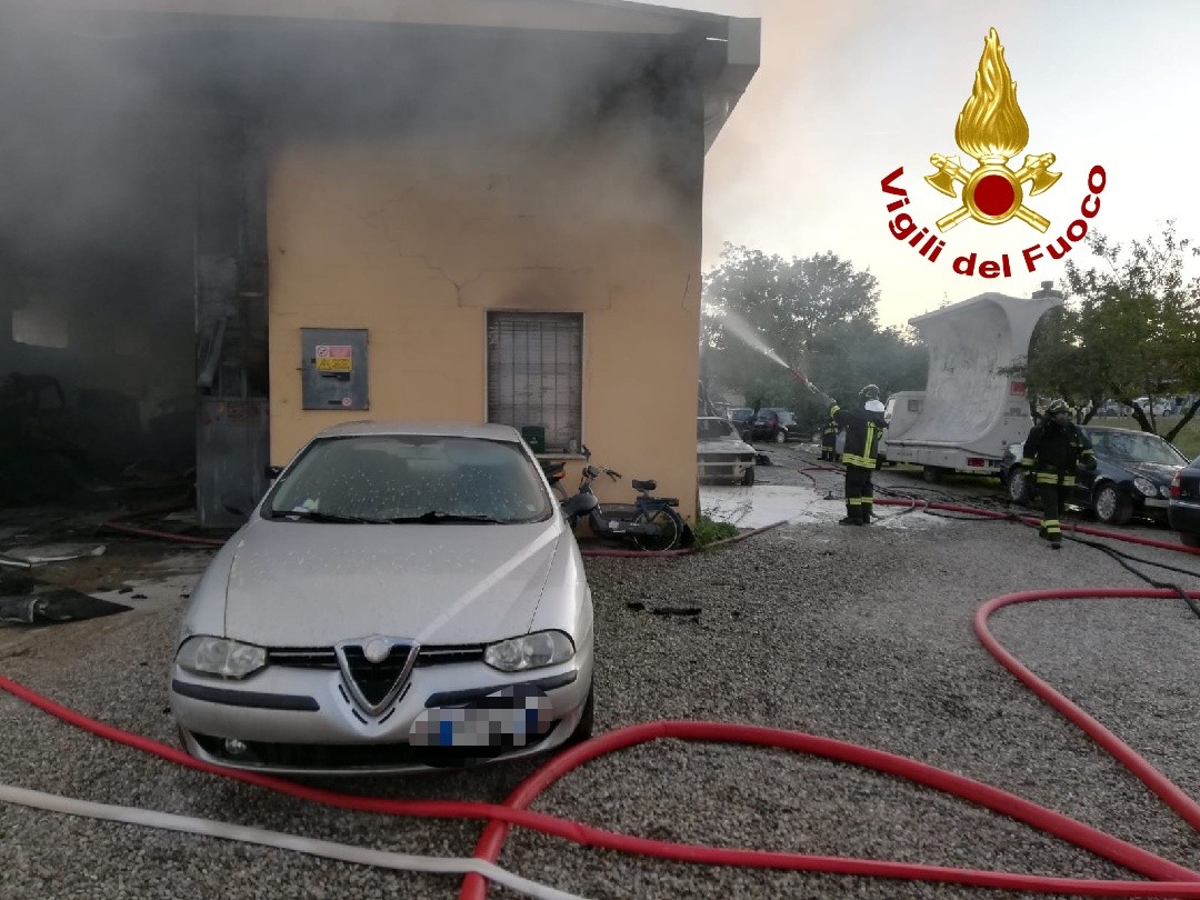 La struttura ha subito ingenti danni e nell’incendio sono andati distrutti 1 furgone, 1 moto e 4 auto. Non si segnalano persone coinvolte e le cause dell’evento sono in corso di accertamento. Al momento l’incendio risulta essere sotto controllo.
