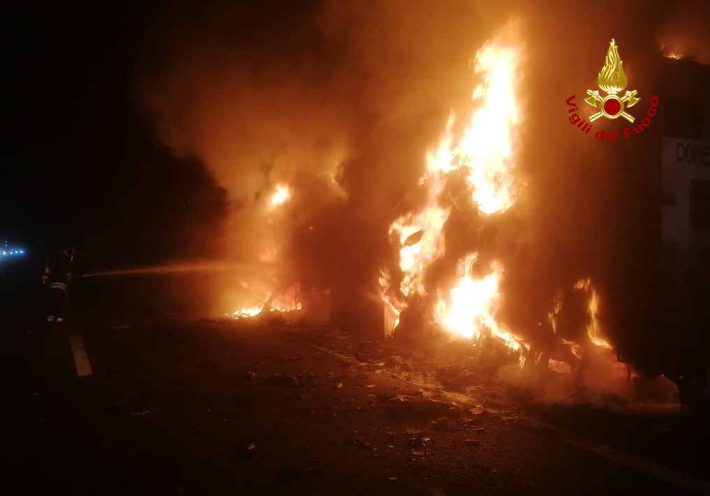 Sempre i vigili del fuoco del comando di Siena e del distaccamento di Montepulciano, con il supporto di personale e mezzi del comando di Arezzo, sono intervenuti qualche ora prima, intorno alle ore 21.30, sempre in autostrada A1 km 390 direzione sud, per un incendio che ha coinvolto un autoarticolato che trasportava materiale vario d’arredo.