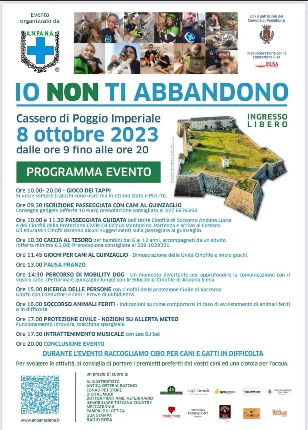“Io non ti abbandono” è il titolo dell’evento dedicato ai cani ed alle loro famiglie che si svolgerà domenica 8 ottobre a Poggibonsi, al Cassero di Poggio Imperiale dalle ore 9 alle ore 20. Evento organizzato da ANPANA Siena, associazione che si occupa della protezione di animali, natura e ambiente, con il patrocinio del Comune di Poggibonsi ed in collaborazione della Fondazione Elsa, che mette insieme appuntamenti informativi e una parte ludica dedicata ai bambini, un intrattenimento per tutti i membri della famiglia che consente di rafforzare il legame con gli animali.