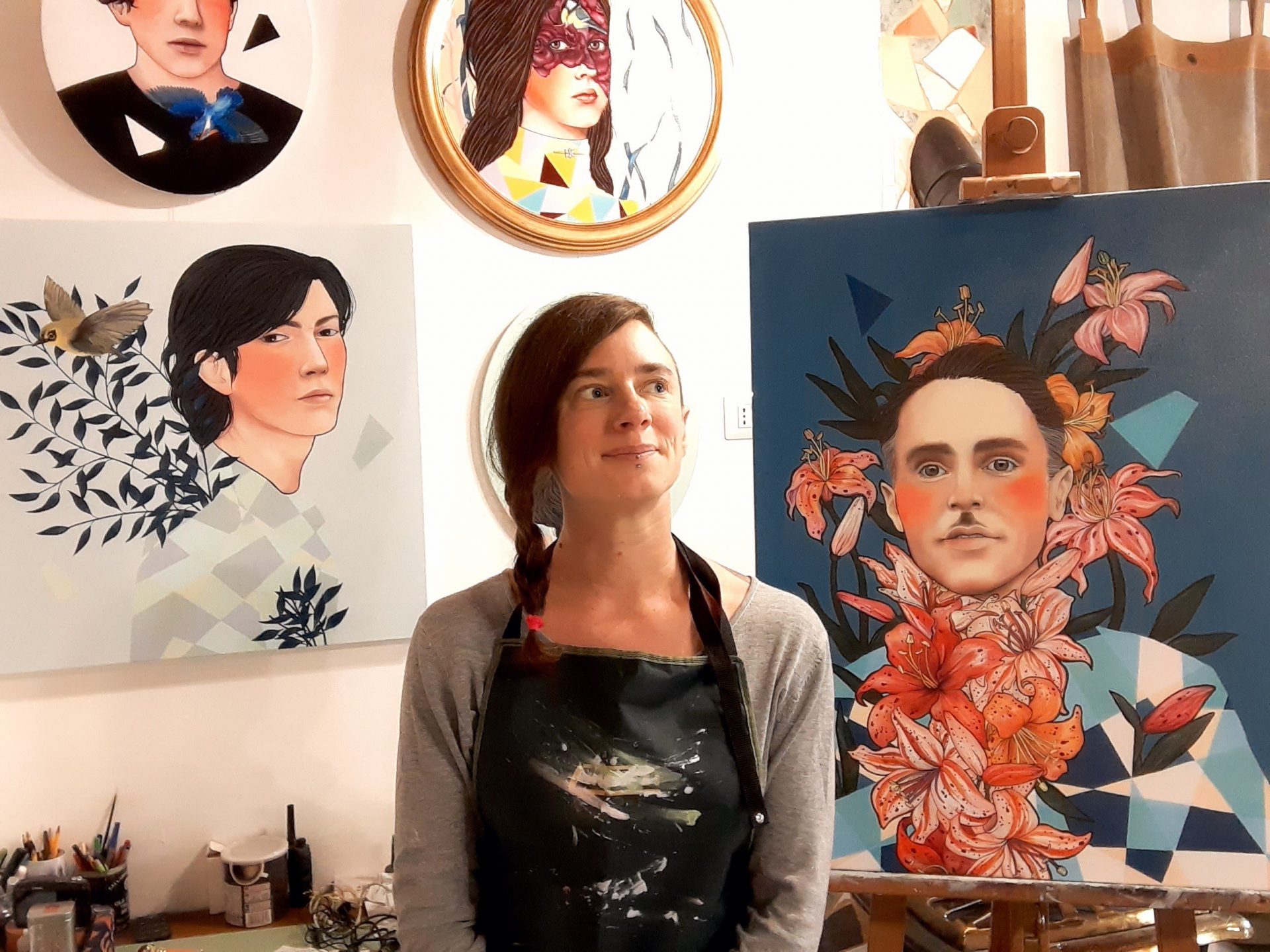 Irene Raspollini è un’artista professionista a tempo pieno, nata a Siena, il 14 agosto 1982. Pittrice autodidatta, ha sviluppato le sue abilità durante anni di sperimentazione. Il suo stile di ritrattistica narrativa collezionabile e immediatamente riconoscibile, con personaggi dalle guance rosee fortemente influenzati dalla cultura pop e dal kitsch, ha recentemente attirato l’attenzione di collezionisti e gallerie internazionali.