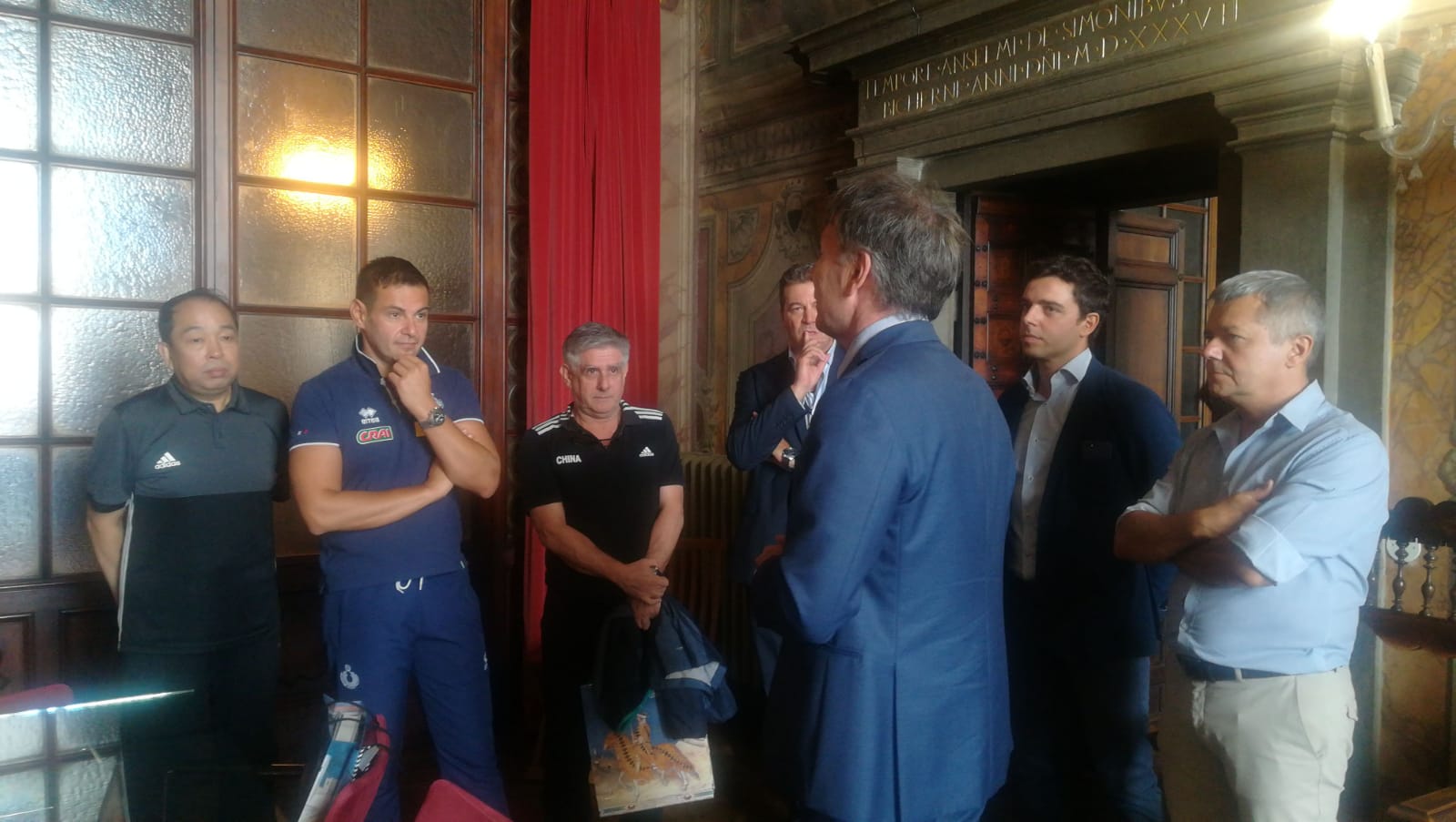 In attesa di scendere in campo per l’amichevole Italia Cina volley di domani, questa mattina a Palazzo Pubblico sono in visita il coach della Nazionale Italiana di pallavolo Gianlorenzo Blengini e il team manager Stefano Sciascia, il coach della Nazionale cinese Raul Iozzano oltre al presidente e vice della Emma Villas Ascheri.