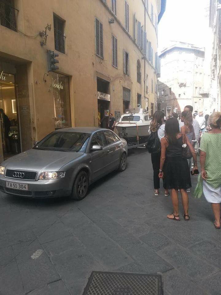 Nel centro storico di Siena avevamo visto un po’ di tutto, ma barche fino ad oggi mai. Ed invece alle 15,30 non è certo passata inosservata l’auto con il carrello sul quale campeggiava proprio una barca.