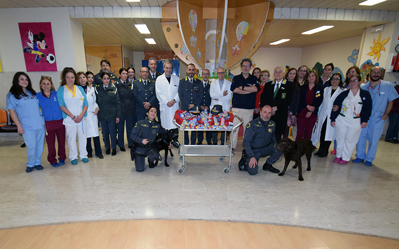 Sorrisi e allegria per i bambini dell’ospedale Santa Maria alle Scotte grazie alla Guardia di Finanza. La Befana delle Fiamme Gialle, accompagnata dalle unità cinofile di Livorno, ha chiuso con gioia e spensieratezza gli eventi natalizi dell’Azienda ospedaliero-universitaria Senese portando doni e regali per i piccoli pazienti del Dipartimento della Donna e dei bambini e della Neuropsichiatria Infantile. Gli uomini e le donne delle Fiamme Gialle, guidati dal comandante provinciale, il colonnello Pietro Sorbello, e alla presenza del maggiore Nicola Coletta, Comandante del Gruppo Siena, hanno portato le tradizionali calze della Befana insieme a utili gadget della Guardia di Finanza per tutte le bambine e i bambini ricoverati.