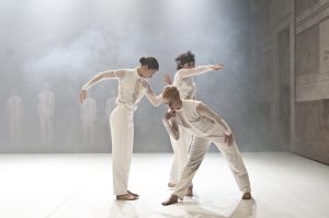 In uno spazio astratto dove domina il bianco anche nei semplici e raffinati costumi di tute unisex e nella brumosa atmosfera che li avvolge, otto interpreti disegnano un paesaggio di corpi trepidanti, dai gesti netti e fluenti, dalle linee continuamente rotte, da una calligrafia pennellata da braccia e gambe stilizzate, da figurazioni geometriche, da palpiti ritmati, posture oscillanti, accelerazioni e fughe. È la White room, la “stanza bianca” dove rivive, ispirato dall’opera pittorica di Segantini, l’inverno emozionale di anime inquiete e in attesa.