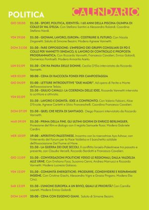 “Vorrei ricordare che come Pd di Colle siamo rimasti tra i pochissimi che continuano a proporre momenti di riflessione e confronto importanti a livello politico e sociale, continuando lo spirito e la tradizione delle vecchie Feste dell’Unità – conclude Enrico Galardi -. È bene ribadirlo, perché non si pensi che la nostra Festa sia al pari di una qualunque sagra di paese”.