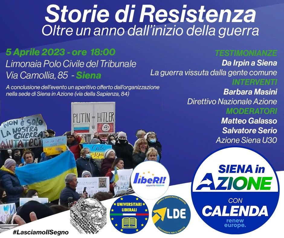 “Storie di Resistenza – Oltre un anno dall’inizio della guerra”. E’ questo il titolo dell’iniziativa pubblica organizzata dal gruppo Under 30 di Siena in Azione, che si svolgerà oggi pomeriggio, alle ore 18, nella Limonaia Polo Civile del Tribunale di Siena, in Via Camollia, 85.