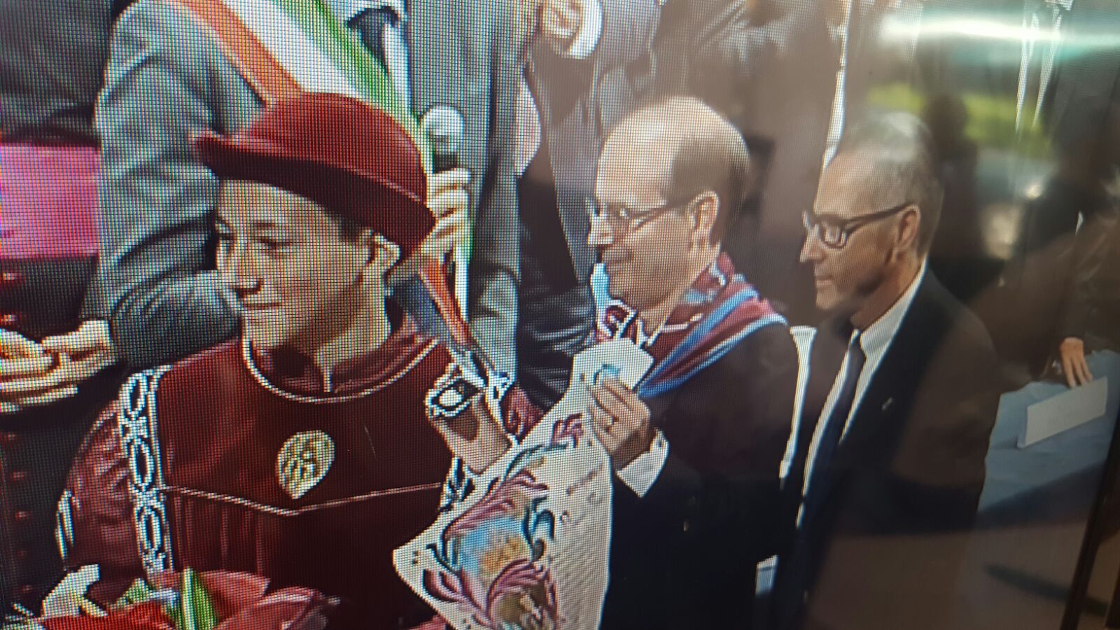 Immagino, anzi, so per certo, che oggi Benucci si senta emozionato due volte: ciò deriva dal fatto che un po’ gioca in casa in quanto dal 1982 sino al 2000, in qualità di dipendente dell’Azienda di Promozione Turistica, ha curato con entusiasmo e tatto proprio la Segreteria del Premio Mangia. Per anni, suoi sono stati i testi delle pergamene, poi illustrate da Irio Sbardellati e Vita di Benedetto.