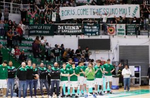 Introdotto dal presidente Francesco Frati al centro del parquet, il Palaestra dedica all’idolo biancoverde più di un lungo applauso e l’immancabile coro “Olè olè olè Boris Gorenc”. “Grande Siena. Siete la migliore tifoseria d’Italia e oltre” ricorda con il microfono, parlando in inglese Boris Gorenc. Il giocatore sloveno ricorda con affetto quei due anni intensi, culminati con la vittoria europea. Dopo 25 anni l’amore di Siena per Boris e l’amore di Boris verso Siena è ancora intatto, lo testimoniano le sue parole cariche di affetto. Il Boris Gorenc Day con la sua cerimonia è stata una splendida botta di vita e di fede mensanina.
