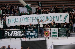 Il pubblico biancoverde ha celebrato uno dei suoi idoli più grandi: Boris Gorenc. In forza alla Mensana dal 2000 al 2002, il giocatore sloveno fu uno degli artefici del primo trofeo, l’indimenticabile e indimenticata Coppa Saporta del 2002. Ma Boris non è solo il trionfo di Lione: talento, temperamento, attaccamento alla maglia e amore per Siena lo hanno consacrato come una leggenda della tifoseria biancoverde, che a lui dedicò pure una coreografia a tutta curva, immortalandolo con la posa “a Cristo Redentor”, sfoggiata da Gorenc contro i rivali storici di Cantù al “Pianella”.