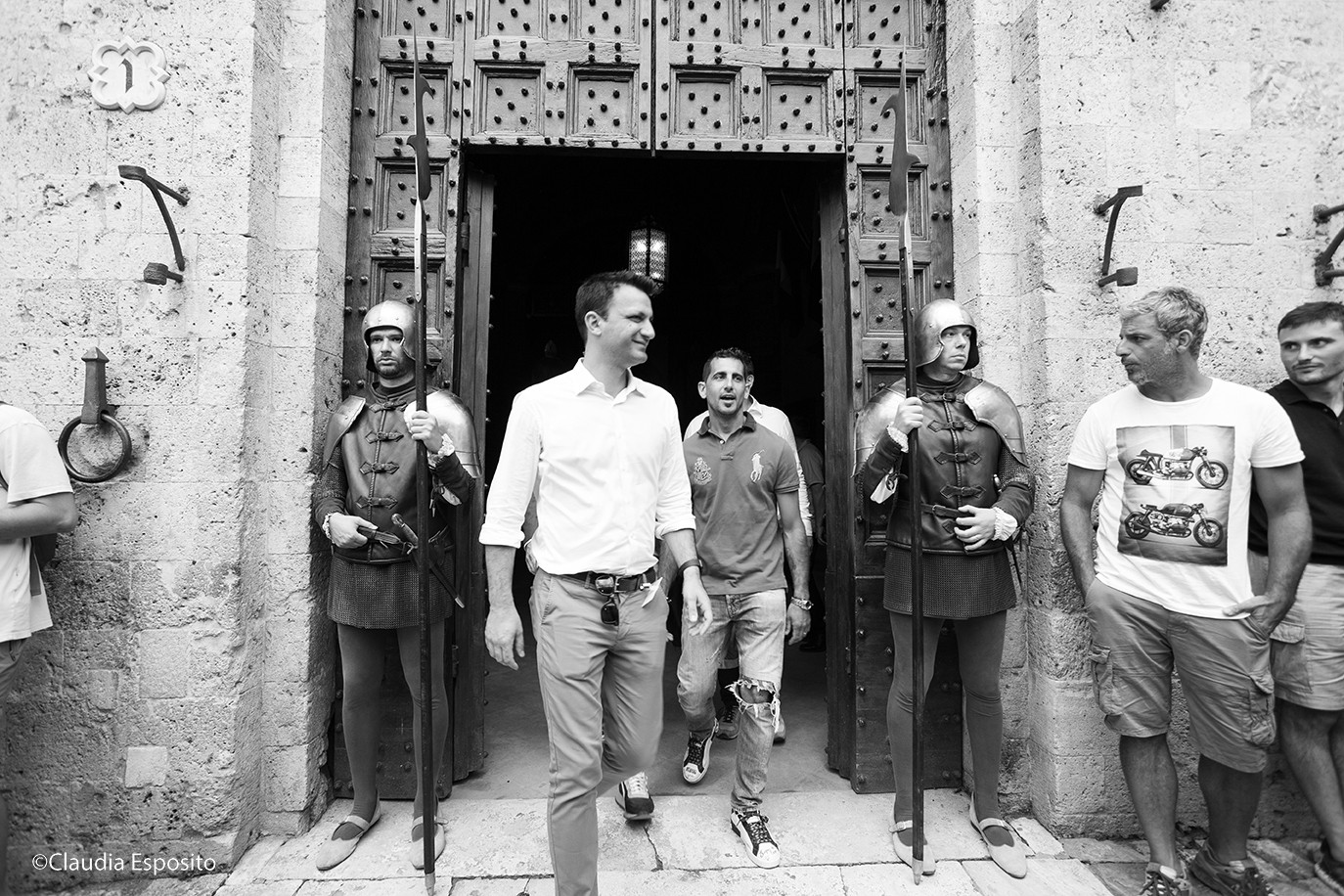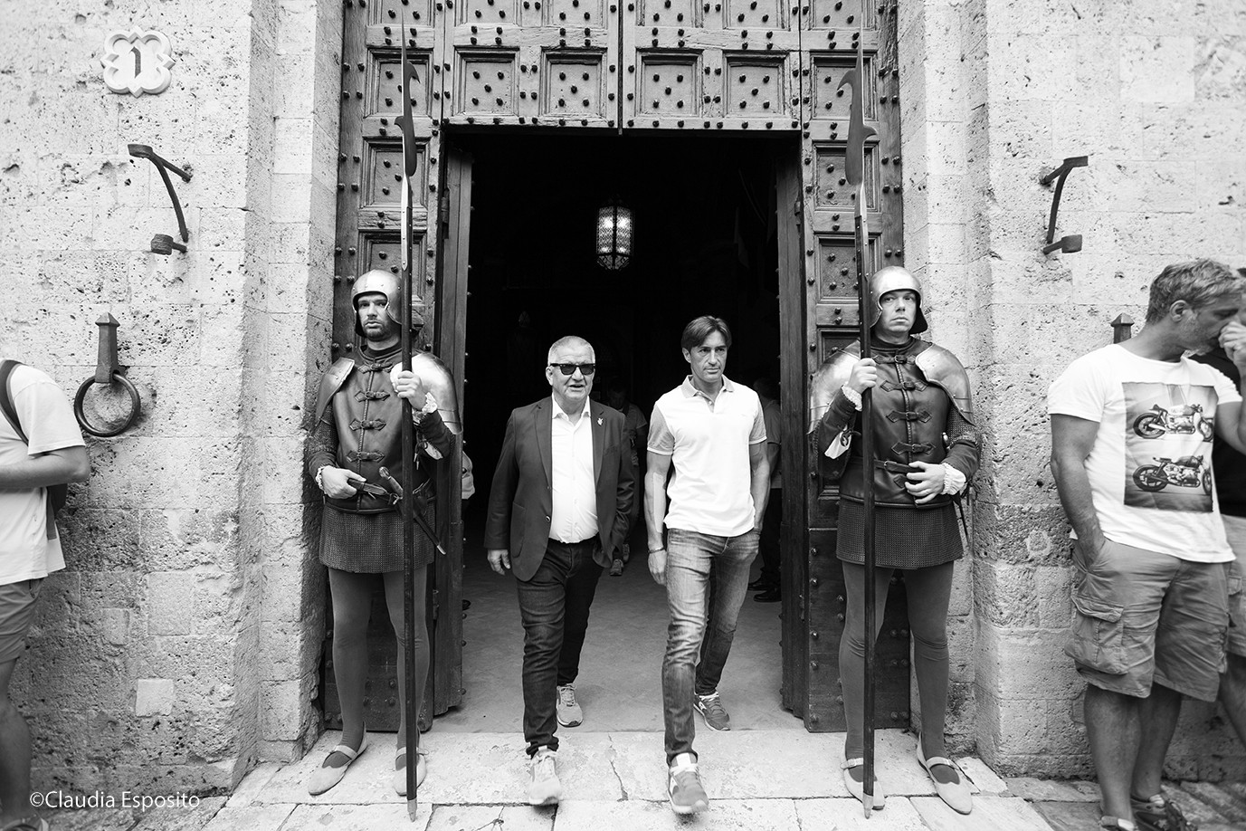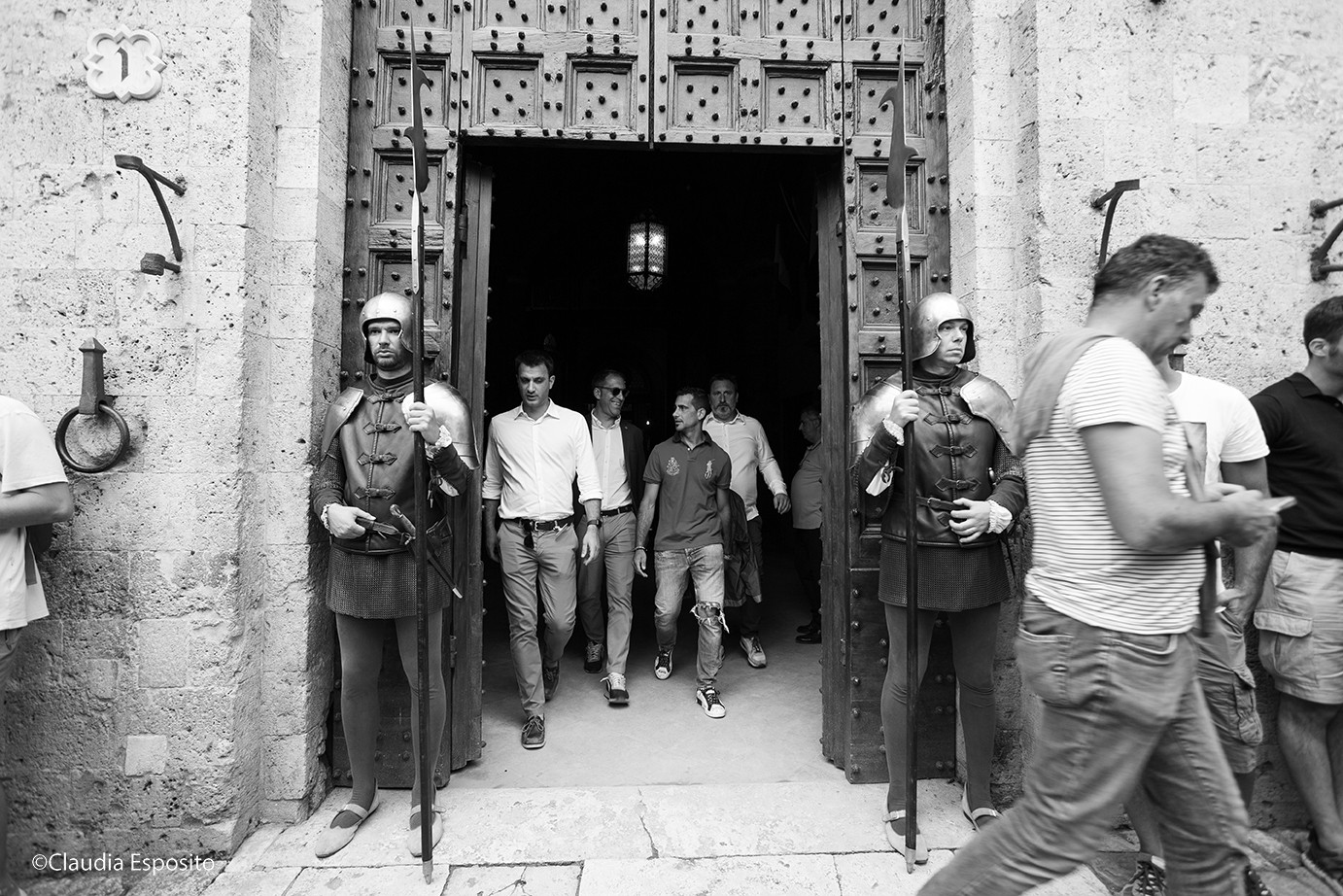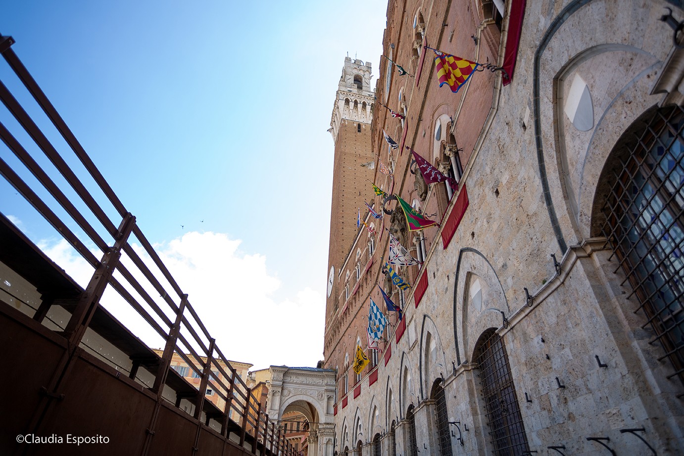La messa del fantino, la mattina presto, in una Piazza poco affollata. Poi la segnatura del fantino, a Palazzo Pubblico: un momento solenne e importante, perchè se fino a questo momento la contrada avrebbe potuto cambiare idea e affidare il cavallo ad un altro “condottiero”, da ora in poi non può più farlo. Due riti emozionanti che caratterizzano la prima parte del giorno del Palio e che noi riproponiamo negli scatti realizzati da Claudia Esposito.