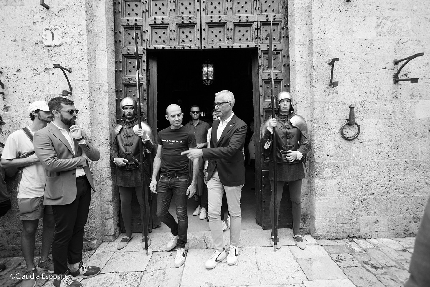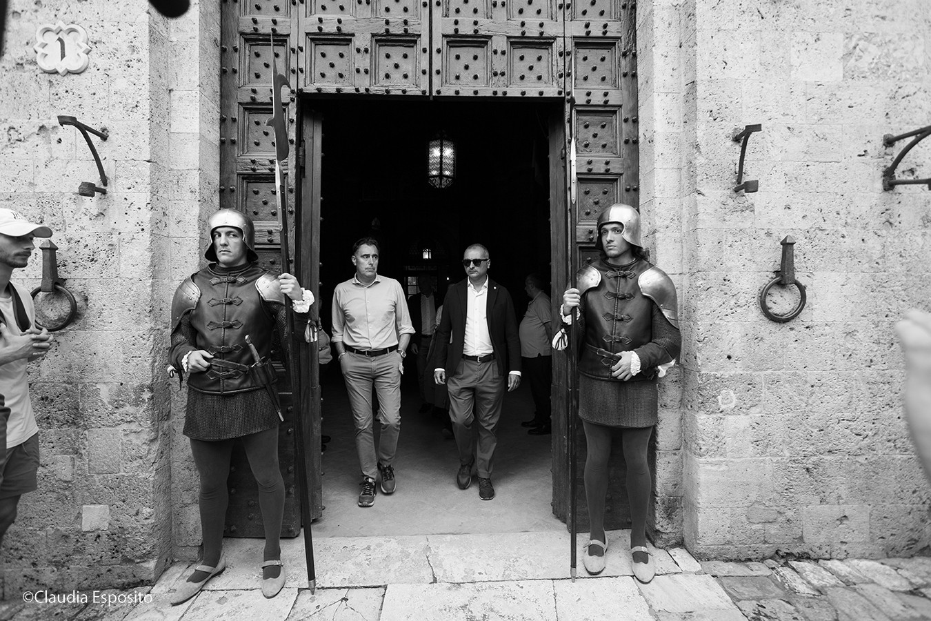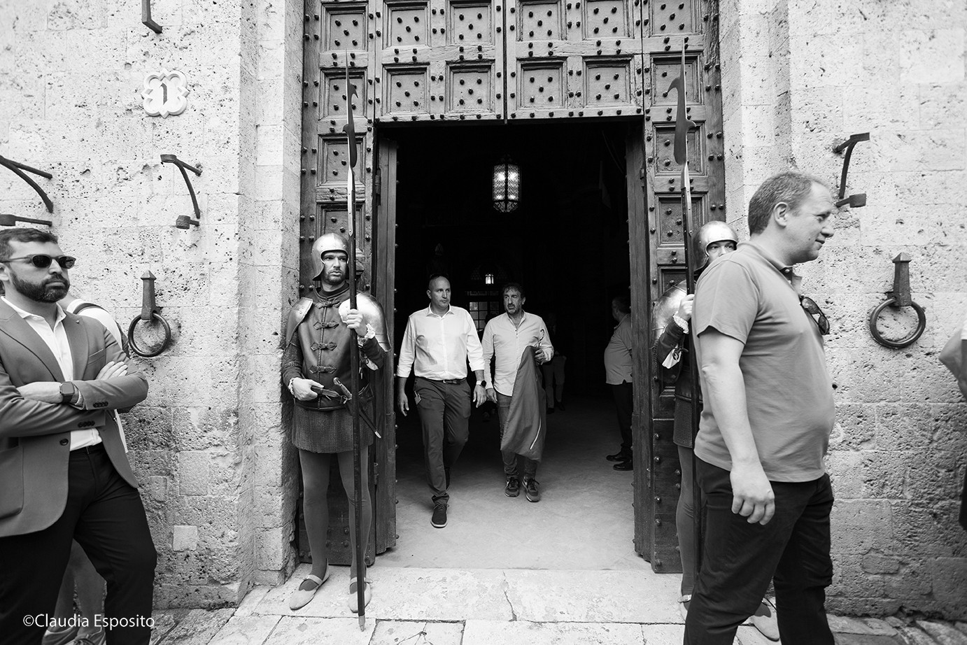 La messa del fantino, la mattina presto, in una Piazza poco affollata. Poi la segnatura del fantino, a Palazzo Pubblico: un momento solenne e importante, perchè se fino a questo momento la contrada avrebbe potuto cambiare idea e affidare il cavallo ad un altro “condottiero”, da ora in poi non può più farlo. Due riti emozionanti che caratterizzano la prima parte del giorno del Palio e che noi riproponiamo negli scatti realizzati da Claudia Esposito.