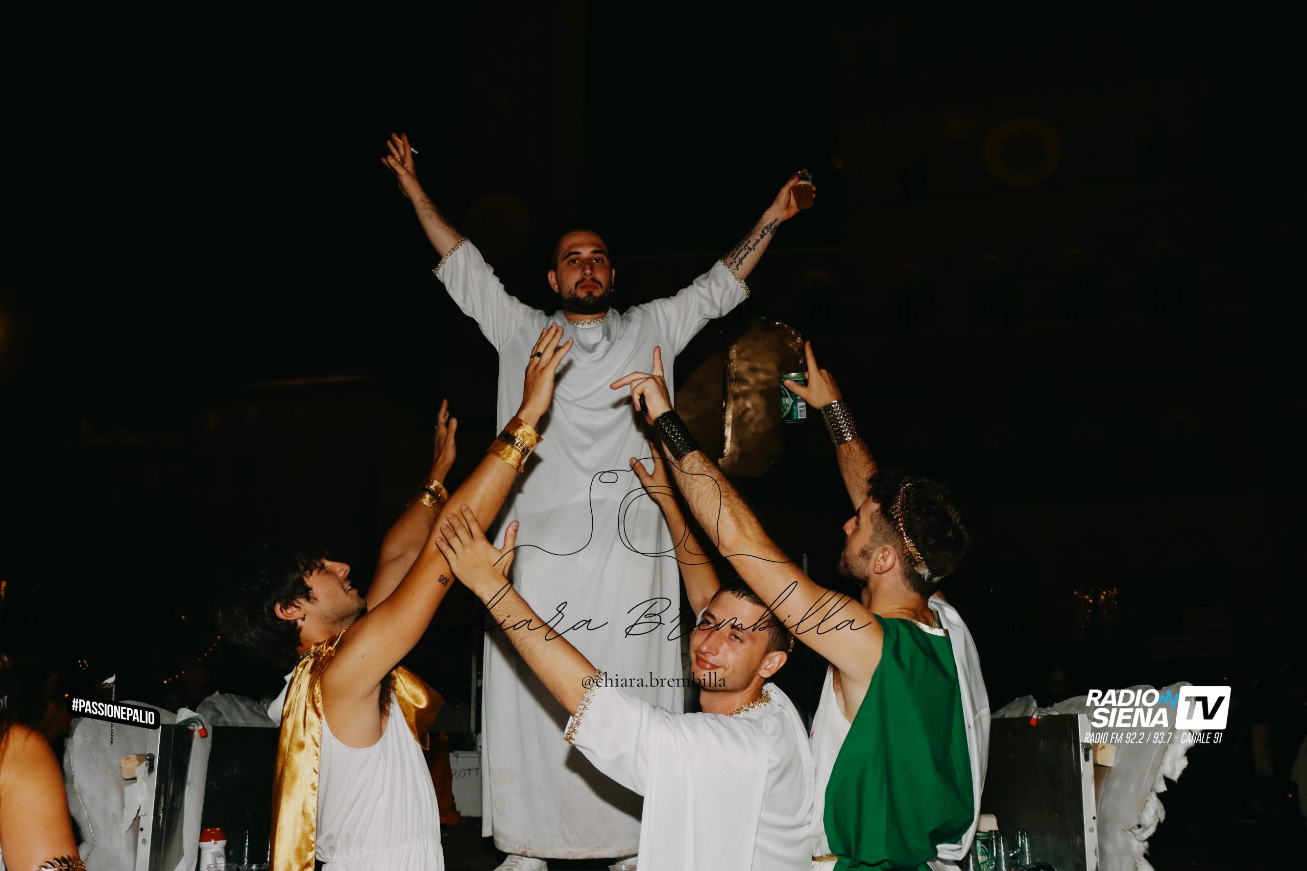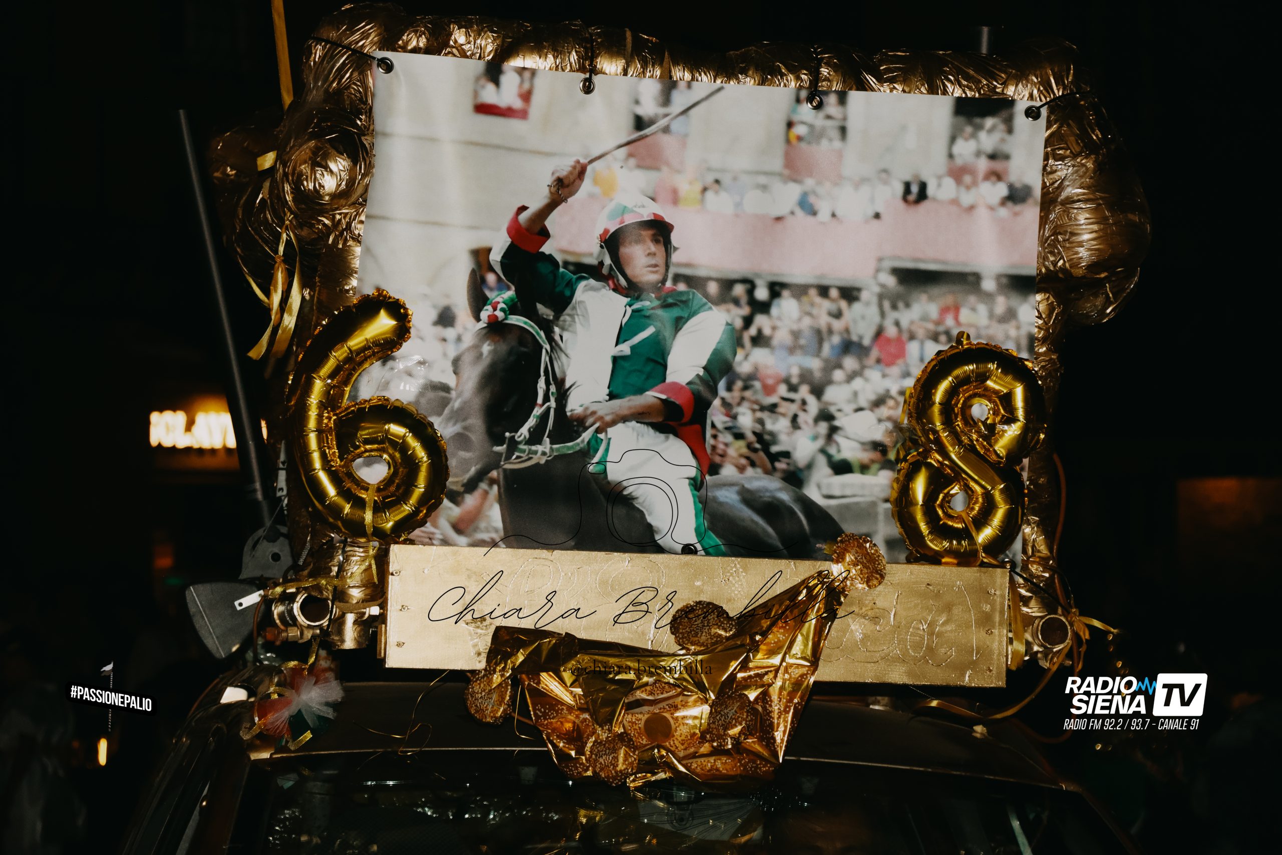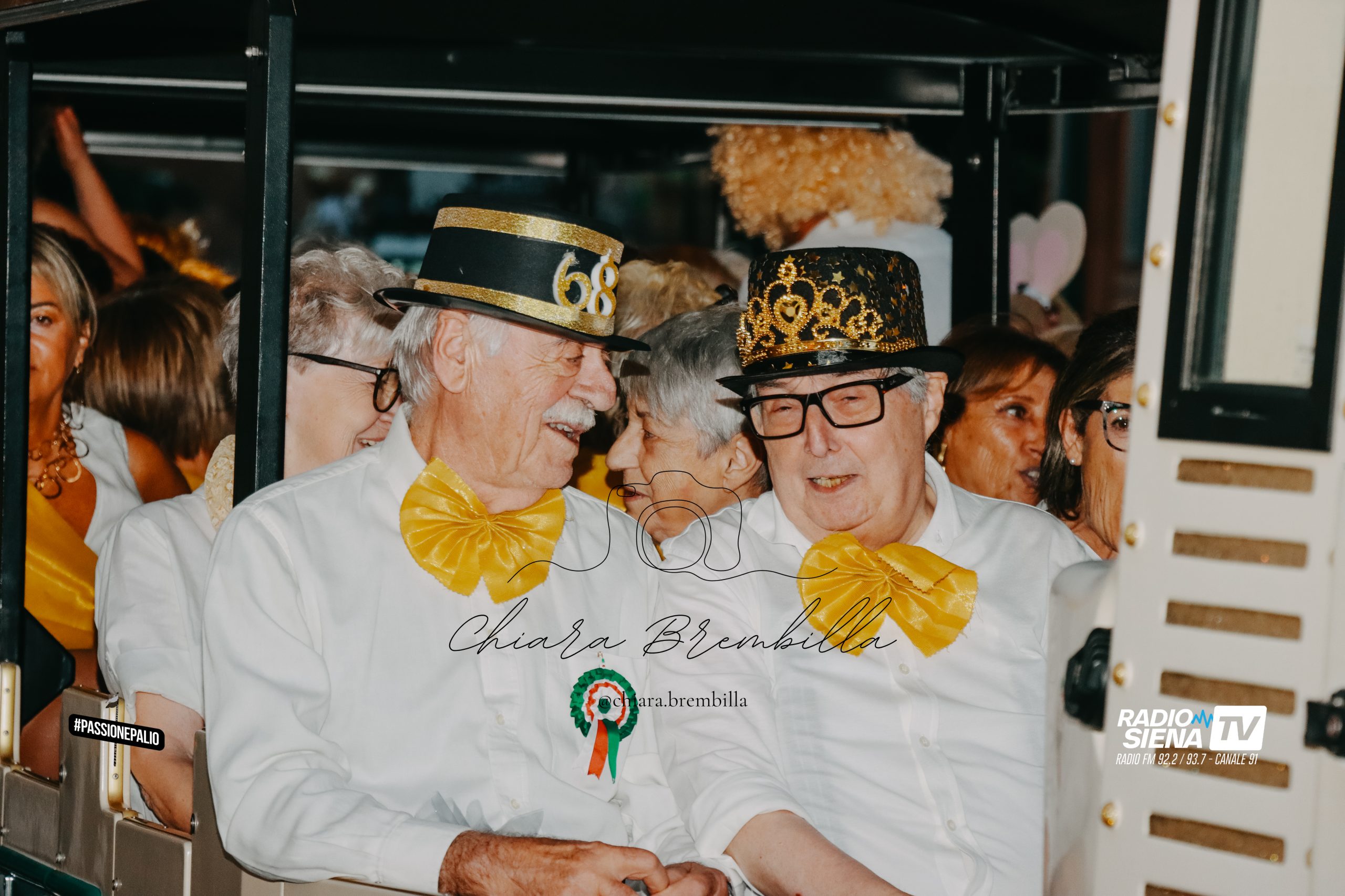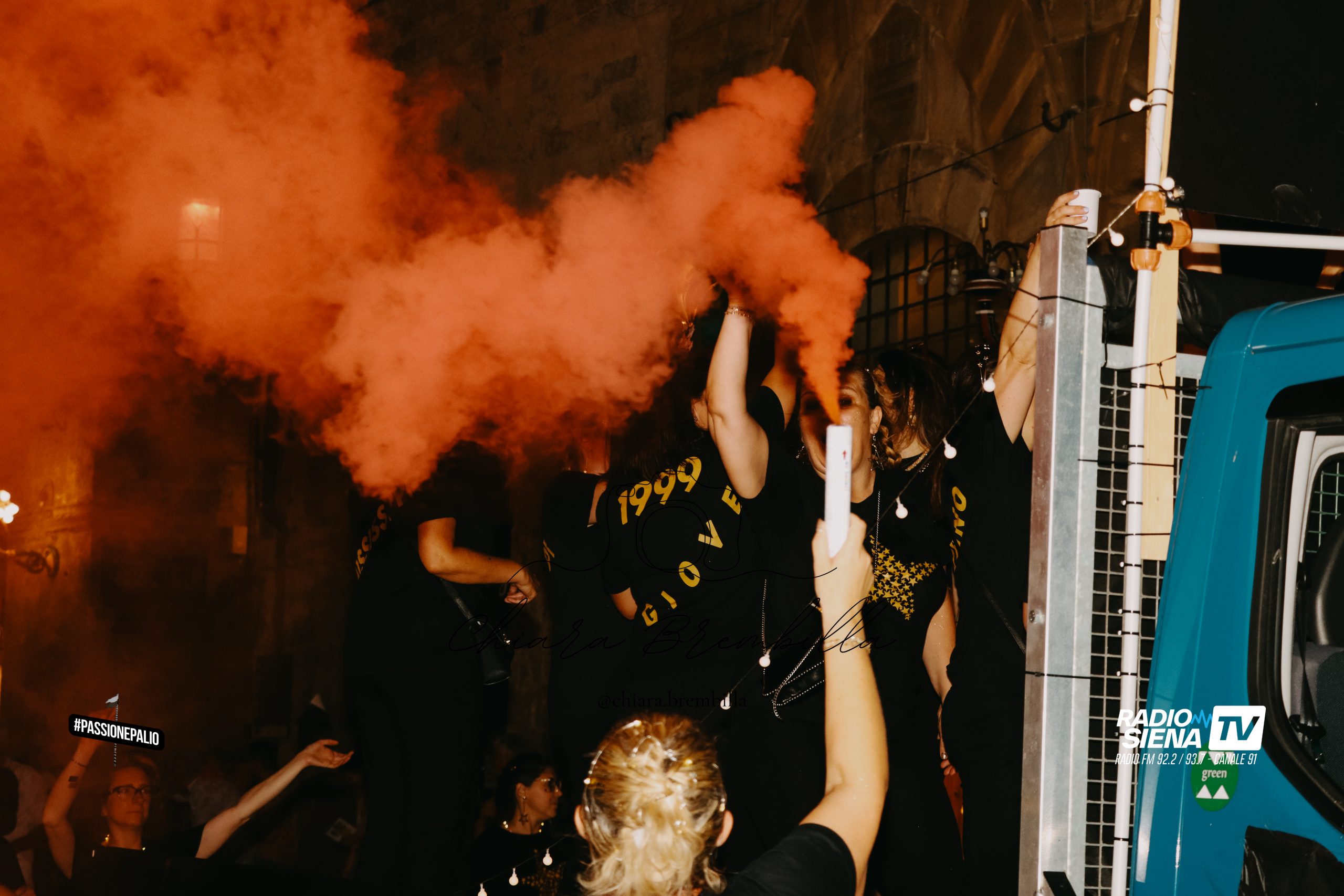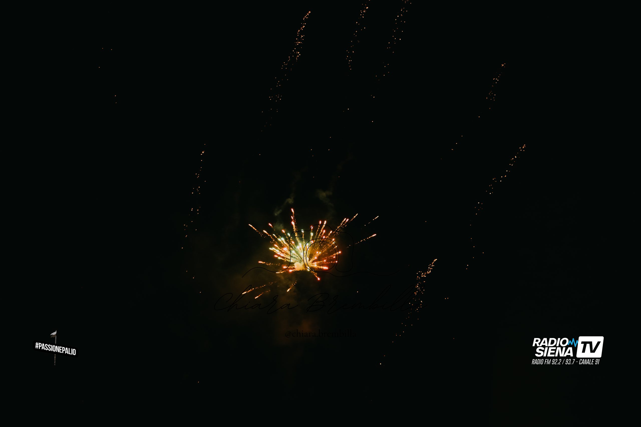 La contrada dell’Oca tinge d’oro la notte di festa. Ieri sera per le strade di Siena il corteo della contrada di Fontebranda, dopo la vittoria del Palio del 3 luglio scorso. Un popolo intero festante con Tittia incoronato re e gran finale con i fuochi d’artificio in Piazza del Campo. Le foto di Chiara Brembilla per Siena Tv