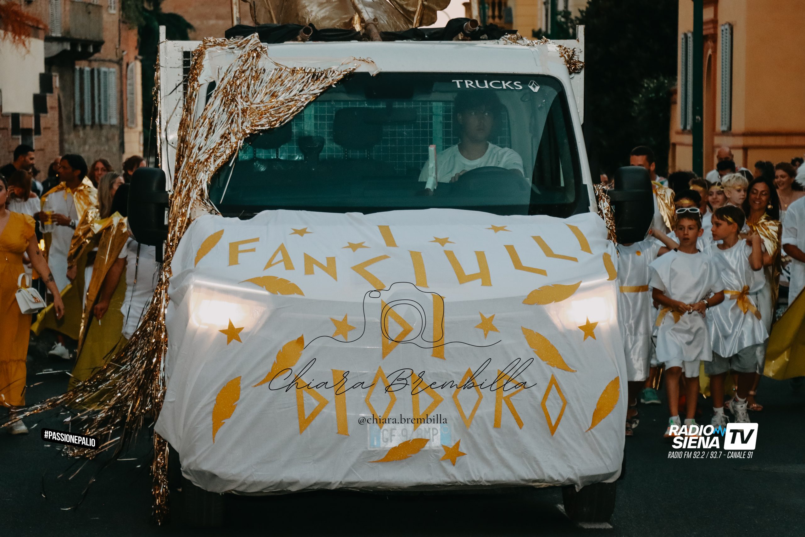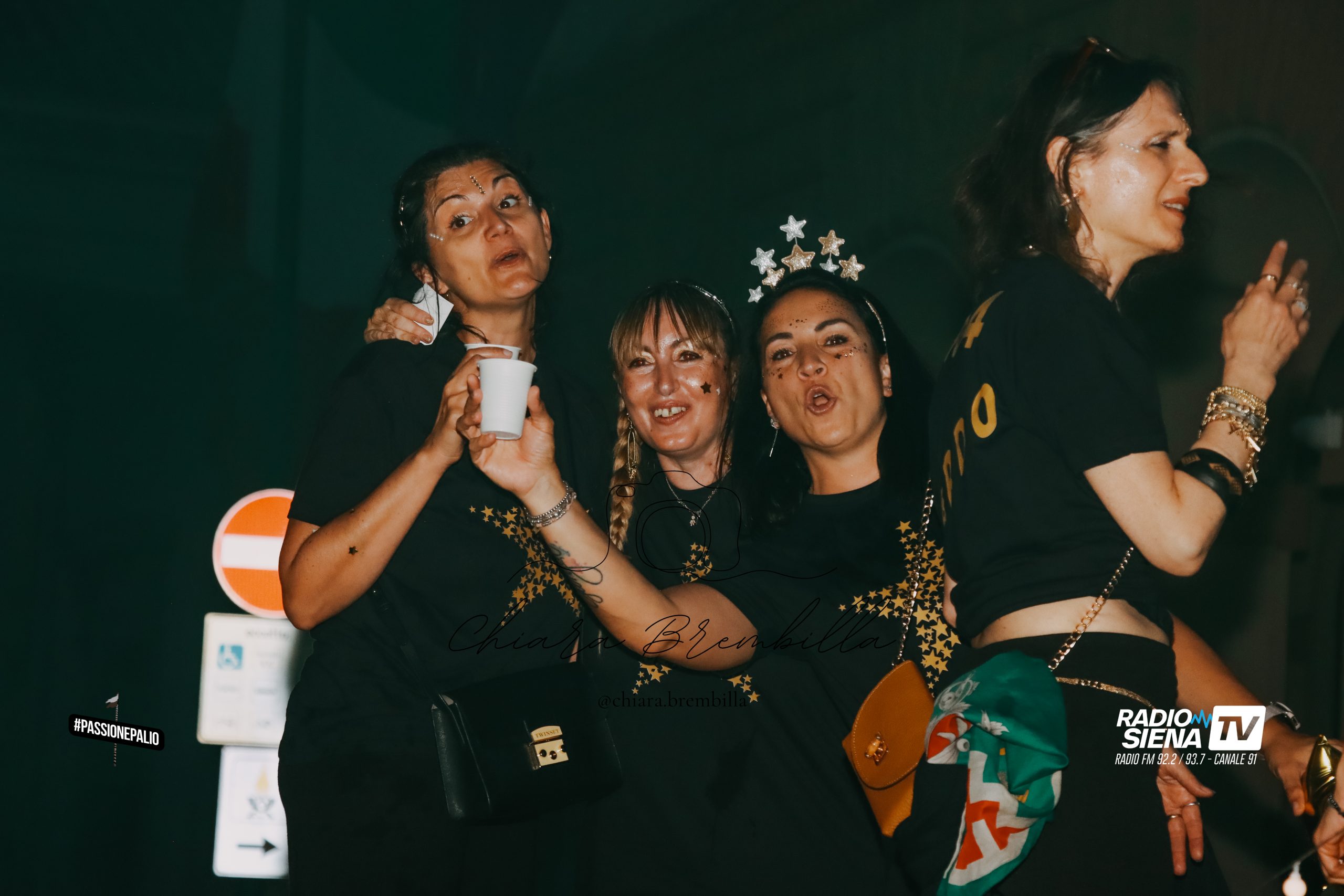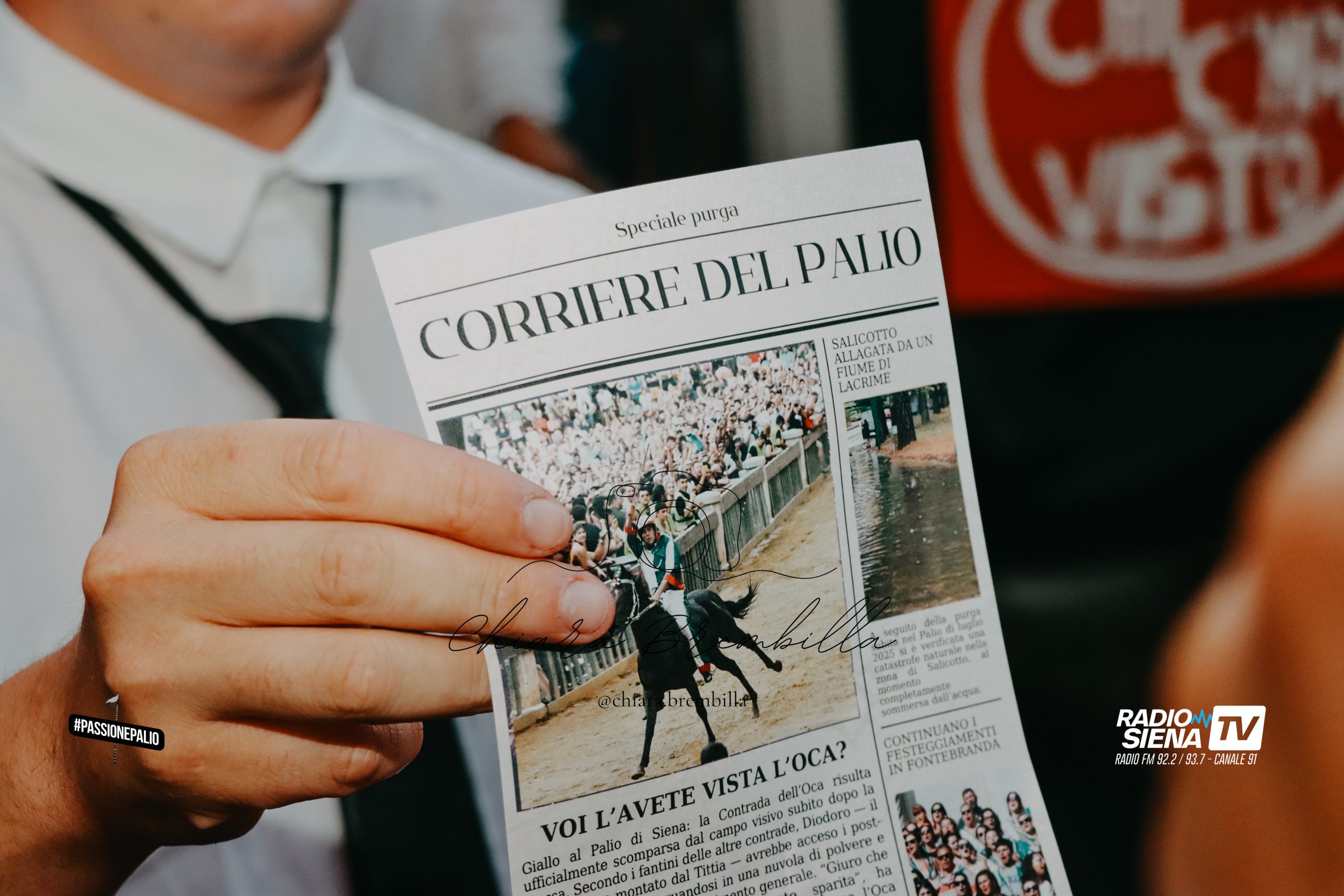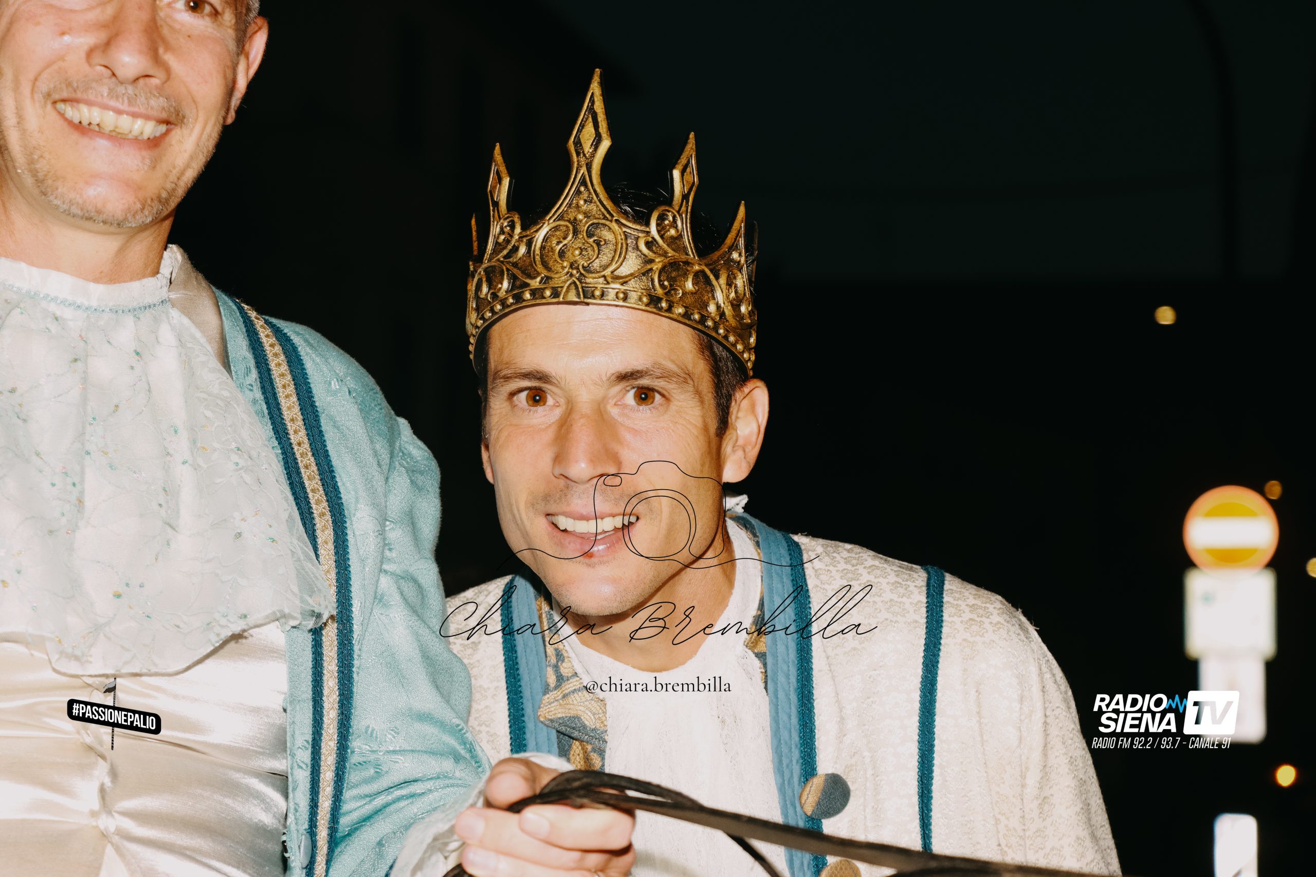 La contrada dell’Oca tinge d’oro la notte di festa. Ieri sera per le strade di Siena il corteo della contrada di Fontebranda, dopo la vittoria del Palio del 3 luglio scorso. Un popolo intero festante con Tittia incoronato re e gran finale con i fuochi d’artificio in Piazza del Campo. Le foto di Chiara Brembilla per Siena Tv