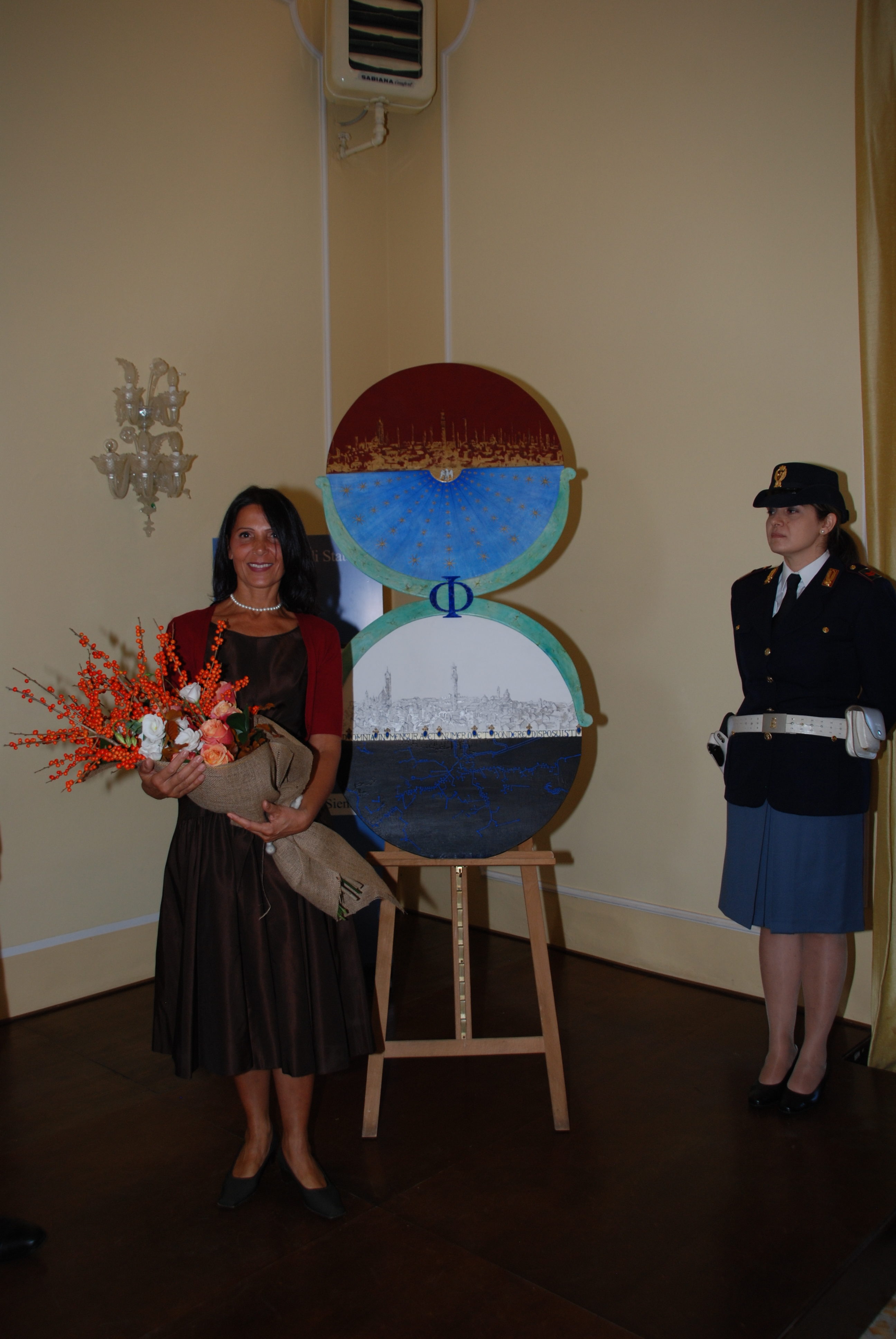 Dopo la Messa, nel Salone d’Onore della Caserma Piave, sede degli uffici logistici della Questura, si è tenuta infatti un’altra piccola cerimonia, aperta dal Questore Maurizio Piccolotti, in occasione della quale l’artista senese Cecilia Rigacci ha donato alla Polizia di Stato l’opera “Arcana Civitas” da lei realizzata.