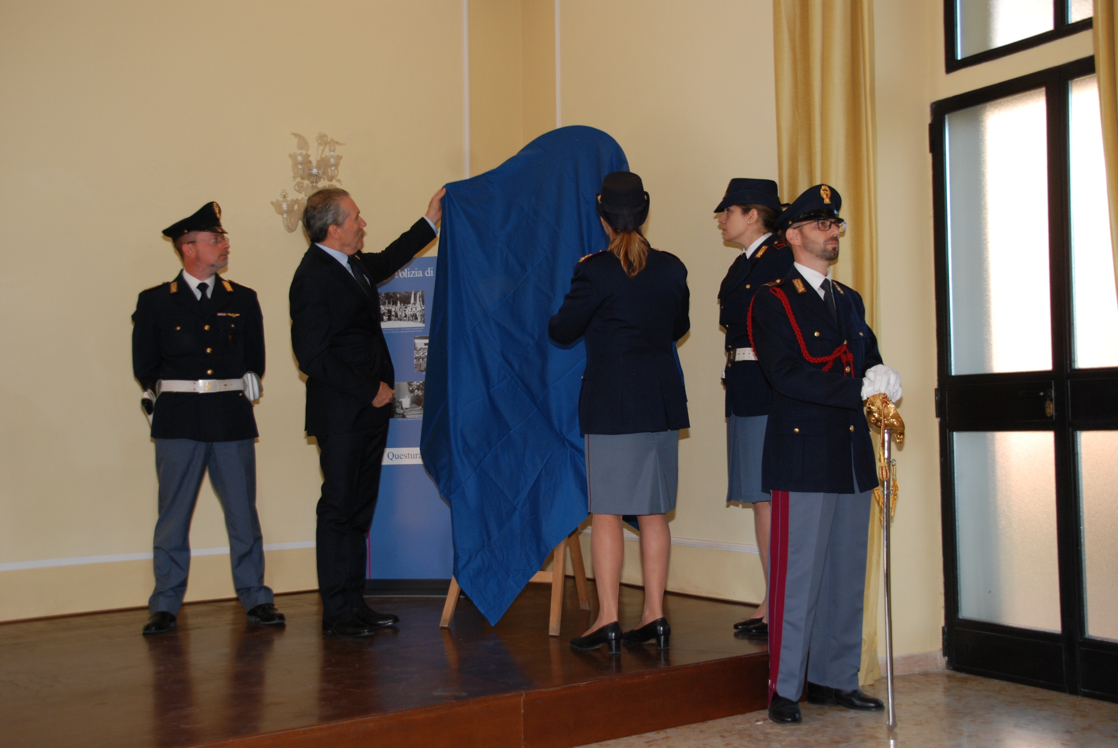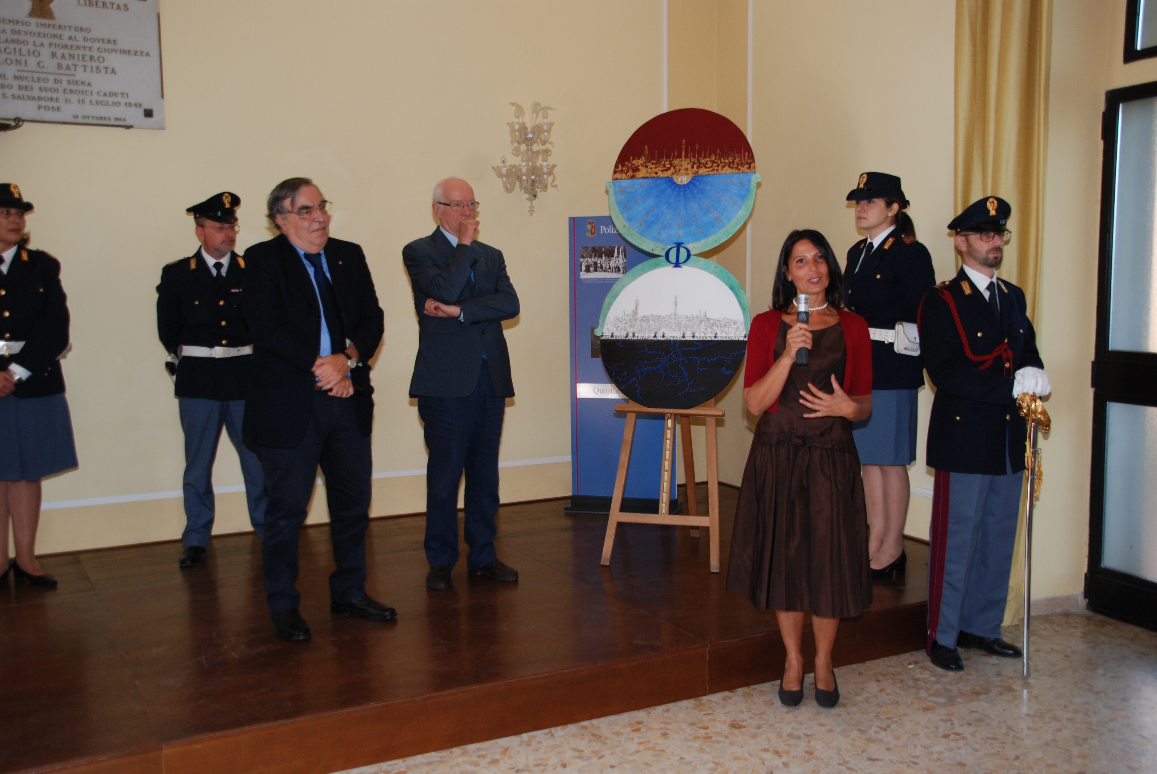 Cecilia Rigacci che, come noto, esegue a Siena lavori di artigianato artistico ed orafo finalizzato al recupero delle tradizioni iconografiche, con un po’ di emozione, ha quindi reso omaggio di quest’opera che, come ha sottolineato anche il Questore nel ringraziarla, ricorda molto la Polizia di Stato, per i colori utilizzati, il cremisi e il blu, e nella simbologia, come è per l’”aquila dell’imperatore”, simile al fregio sul berretto dei poliziotti.